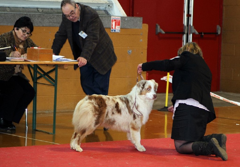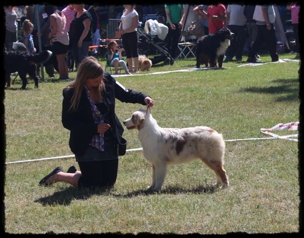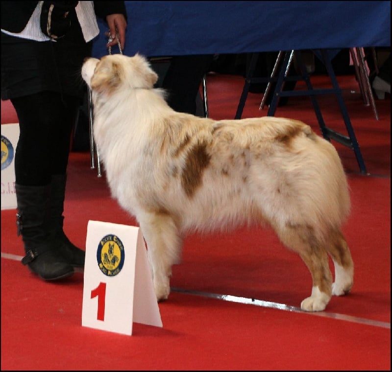 DCC, Féminine, bien typé, bel ensemble, jolie tête de bébé, jolie expression, Harmonieuse, bien construite, Excellent dessus et dessous, excellente ossature, excellentes angulations, excellent pied et applomds. Avant et Arrière mains bien parallèles. Joli mouvement de profils, le dos roule à l'action.