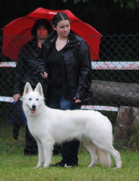 Sujet un peu réservé mais sympa à l'examen. forme de tête bien en coin. Oeil foncé en amande. Très belle pigmentation. Très belle encolure. Sujet excellent construction d'ensemble.Très belle épaule, bras un peu court. Aplombs bien parallèles. Poitrine bien étoffée. Excellente encolure. Très belle poussée des postérieurs. Malgré un bras un peu court, travaille bien avec l'épaule.