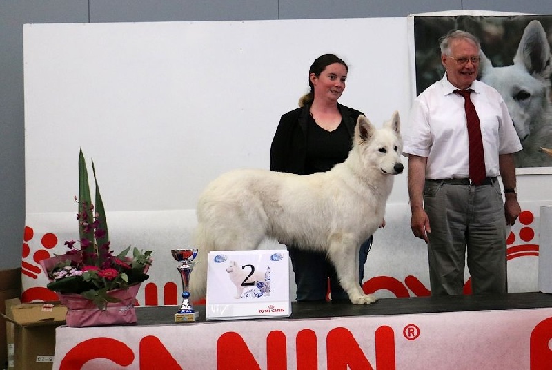 DCC - Très bon construction d'ensemble. Sujet qui manque un peu de puissance dans son ensemble. Ligne de dessus correctBelle sortie d'encolure. Tête féminine en rapport avec l'ensemblePlacement d'oreille correcte mais un peu grandeExcellent ?il foncéMâchoire inférieure un peu justeExcellent épaule. Pieds pourraient être plus fermesMétacarpes un peu souplePoitrine encore justeAngulations arrières correcteTrès belle croupe et fouetExcellent caractèreAllures correctes - Dos un peu souple