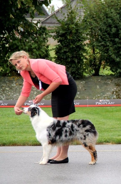 DCCJolie tête TB expression, excl oeil forme/couleur.TB oreille B imp/portée.TB prop, dos assez tendu, B croupe, exc poitrine.TB ossature en rapport, TB aplombs, TB anguléB mouvement/allure à dynamiser