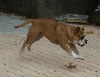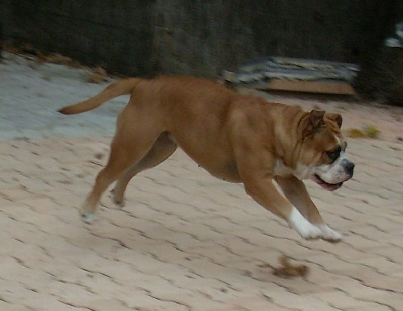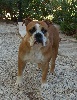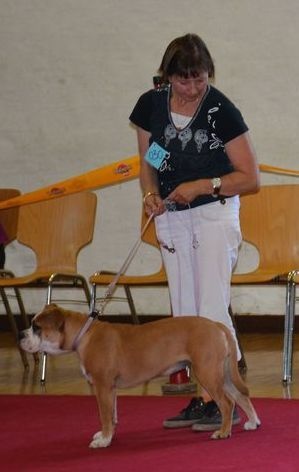chienne de 22 mois de très bonne taille, puissante, épaules et cuisses bien musclées, excellentes oreilles, yeux ronds brun foncés, denture très régulière et complète, garrot accentué dos droit et ferme,excellente attache et longueur du fouet, cotes bien cintrées, poitrine bien descendue, excellent poitrail, membres antérieur droits et de bonne ossature, membres postérieurs parallèles, au niveau du jarret l'angulation est trop ouverte, allures harminieuses