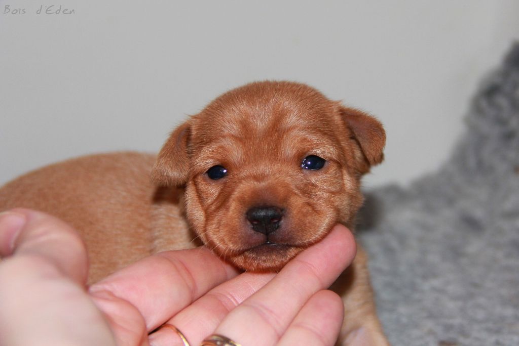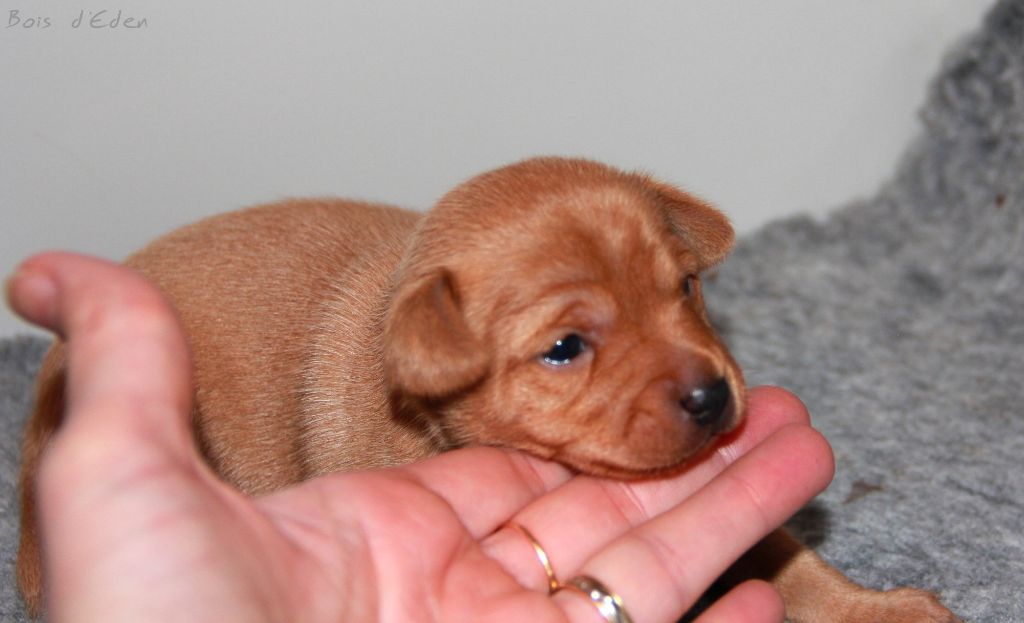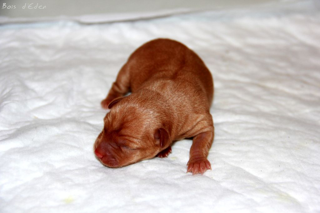 Classe Baby 3/6"Rouge. Chienne très bien construite. Jolie tête de bébé. Oreilles bien portées. Excellente épaule, jolie sortie d'encolure. Excellente poitrine. Le dos solide, arrière main bien angulée, bouet bien implanté, bien porté aux allures. Excellent caractère. Excellente démarche."