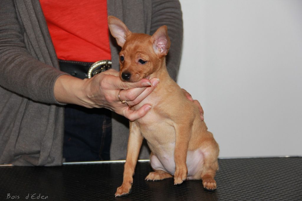 Classe Puppy : " Jolie tête typique avec excellentes oreilles bien placées. Oeil bien foncé. Excellent rapport crâne chanfrein. Lèvres bien ajustées. Excellente denture, excellente sortie d'encolure. Avant bien parallèle. Excellente poitrine et ligne de dos. Excellentes proportions hauteur garrot et longueur. Excellentes angulations arrière et avant. Excellente musculature. Excellente construction générale. Ligne de dos bien tendu en mouvement. Mouvement déjà bien correct."