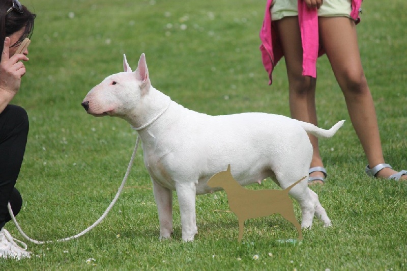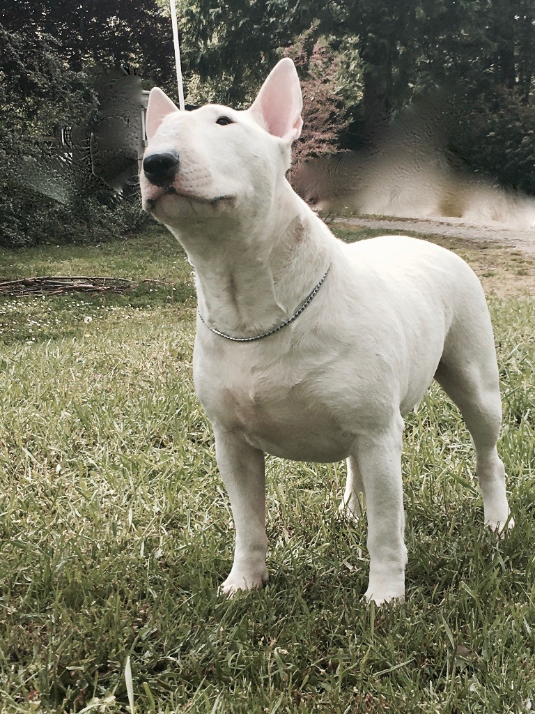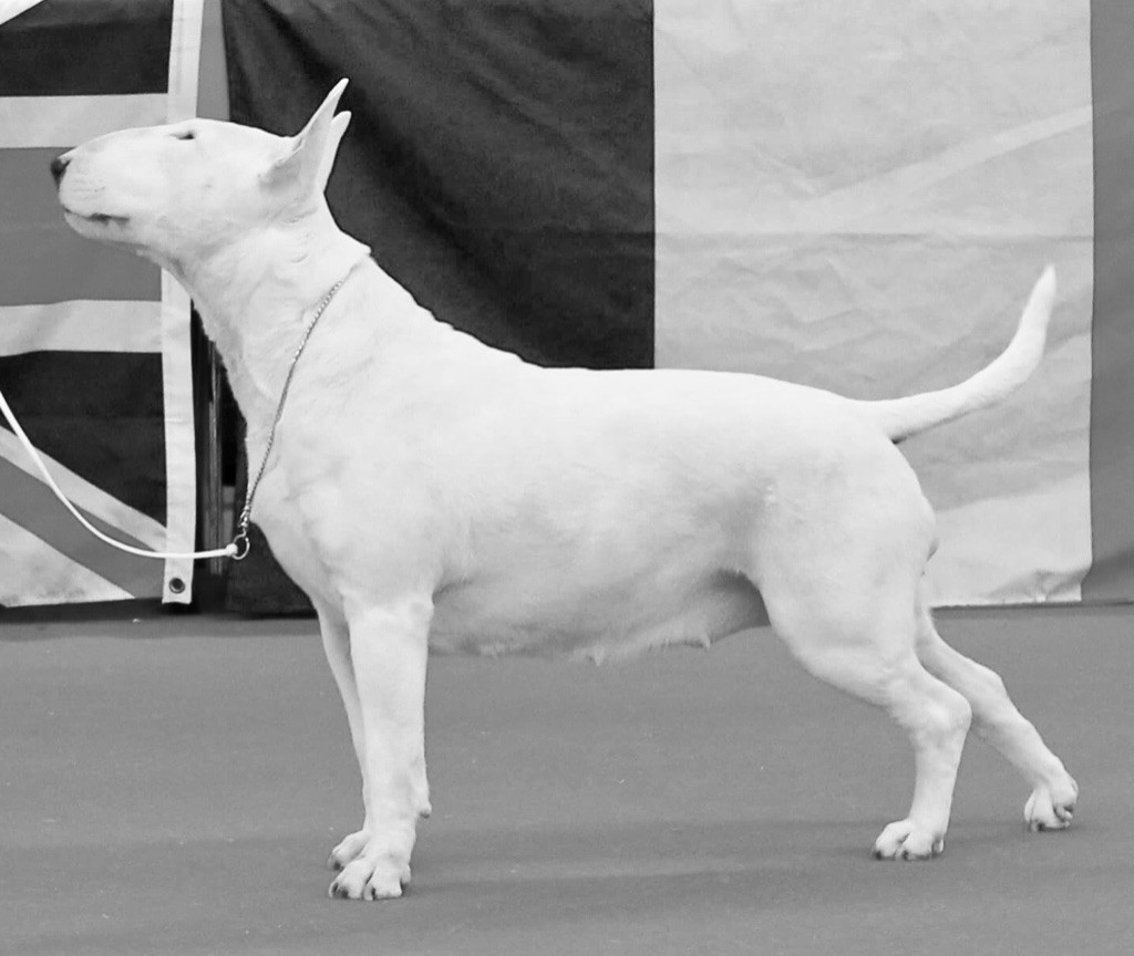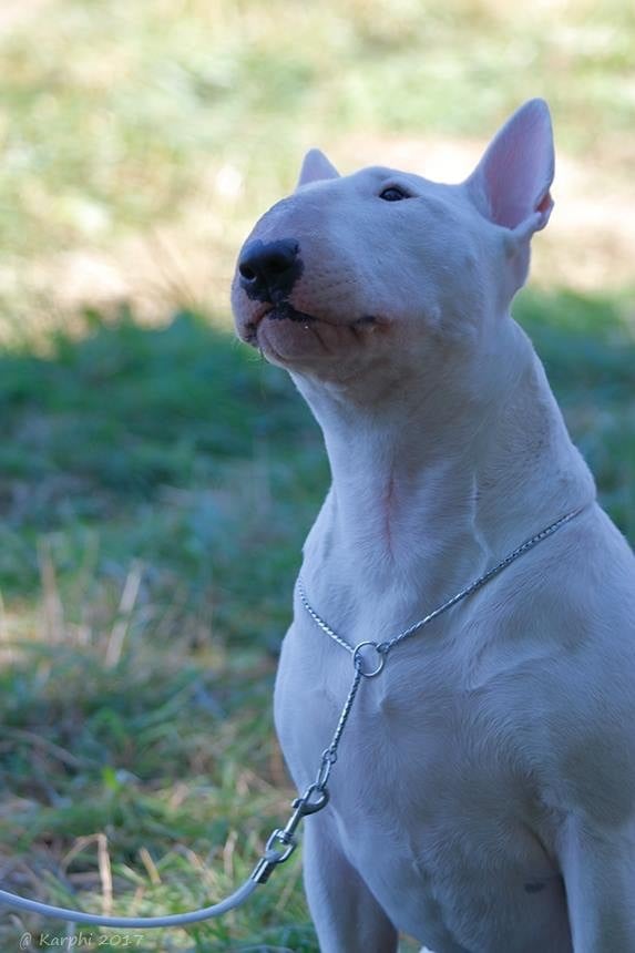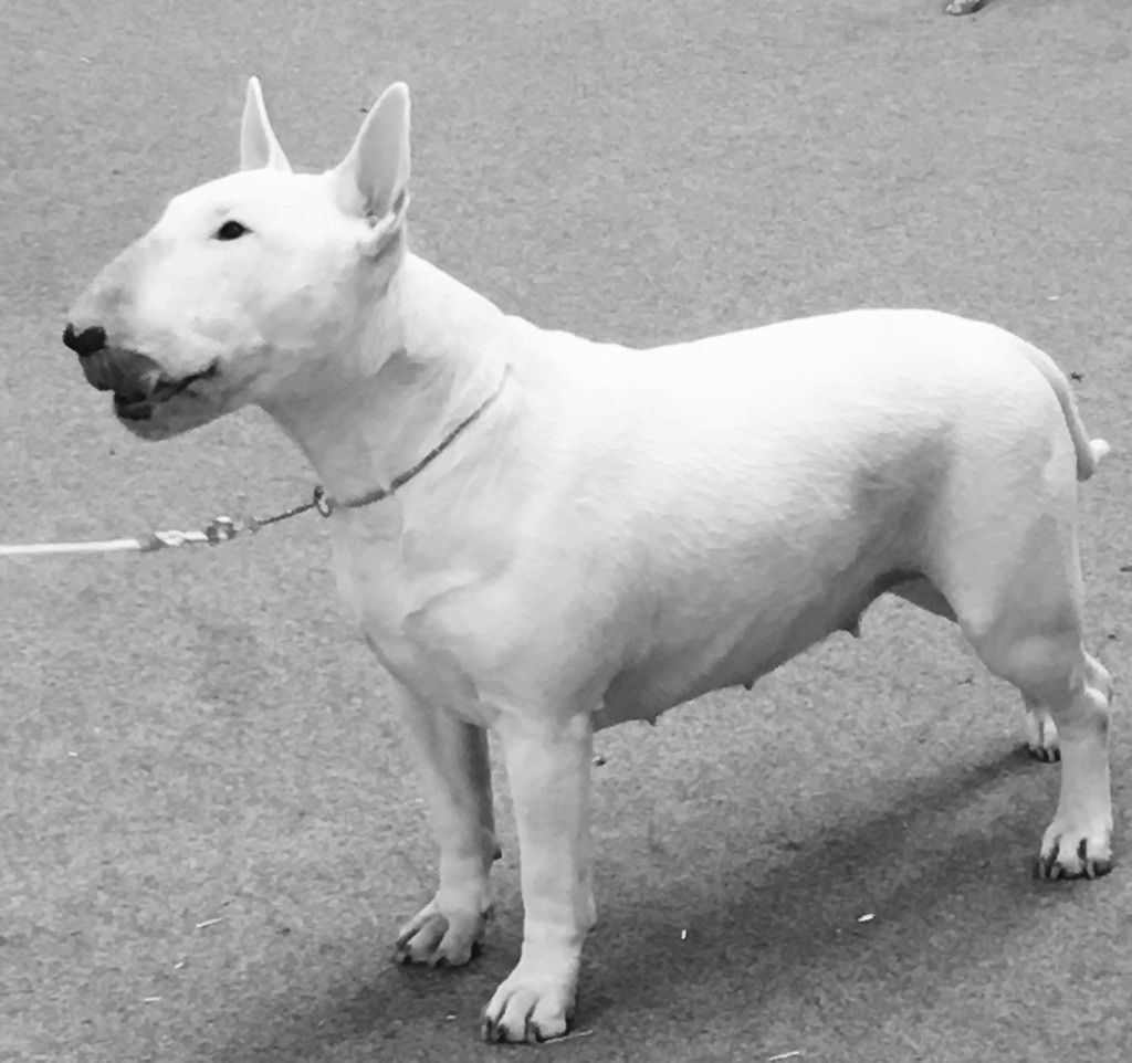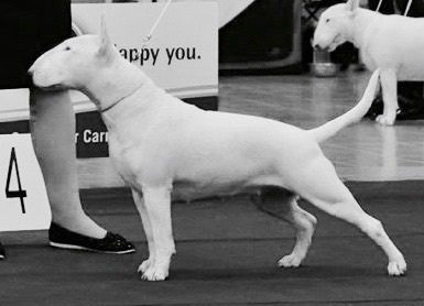 Bon profil avec Bon "Roman finish" (Cassure du bout de nez typique du Bull Terrier)Jolies oreilles Excellent petits yeux Bonne poitrine avant et ligne de dos Bien Angulée à l'arrière Marche serrée avant et arrière