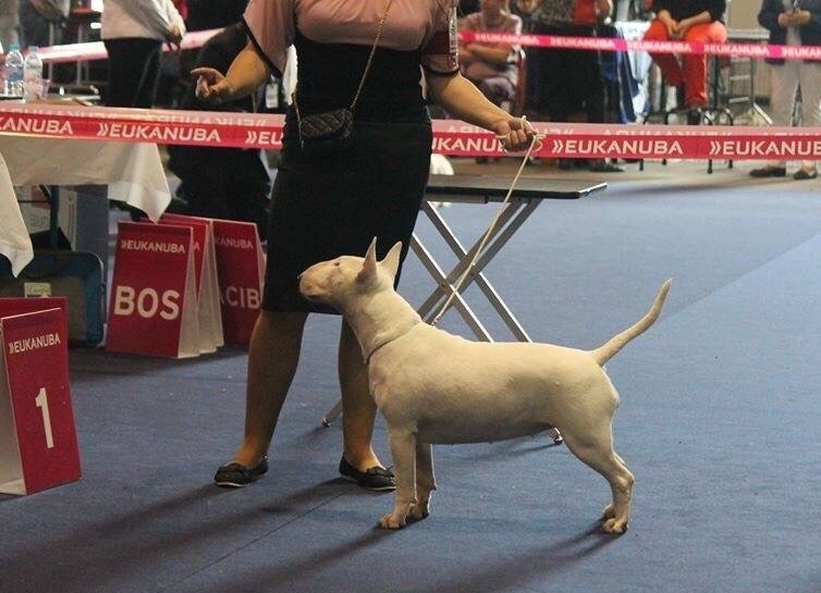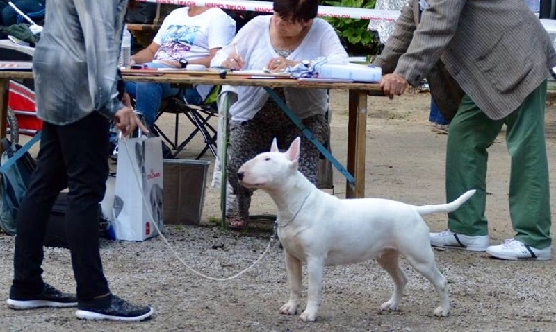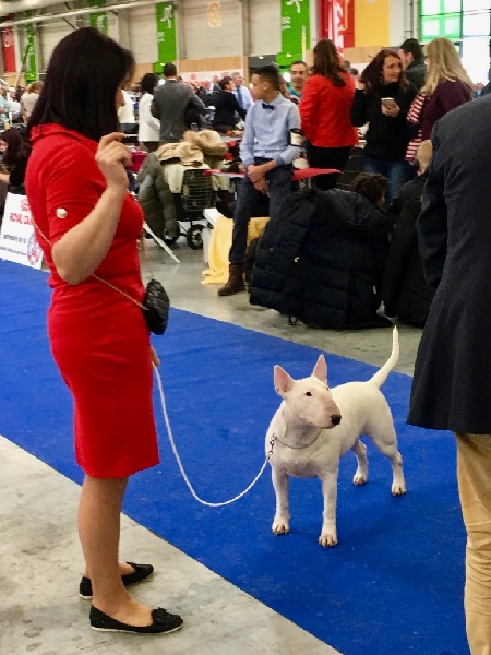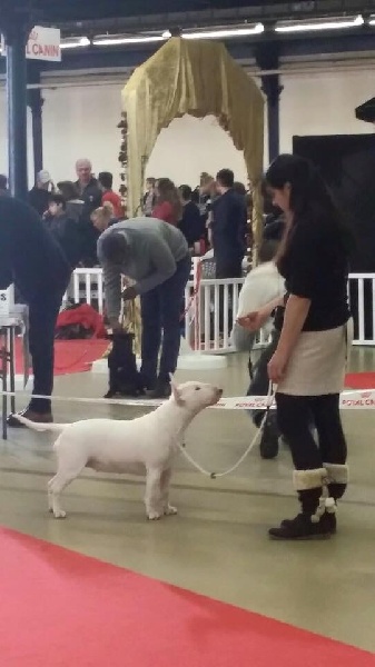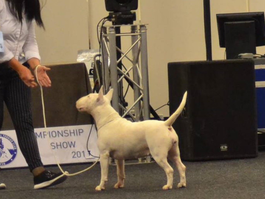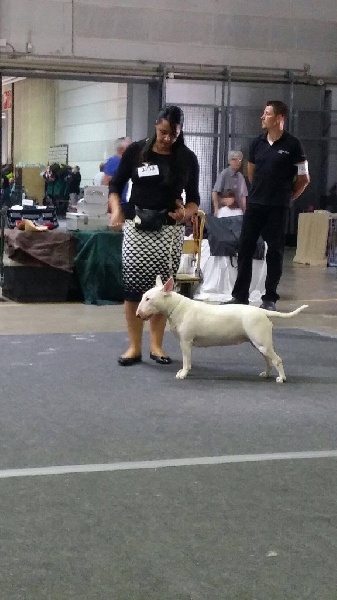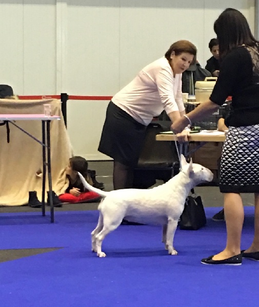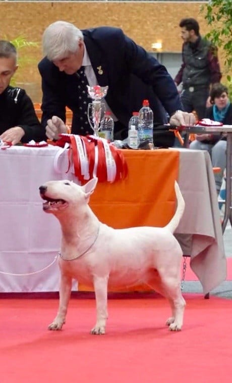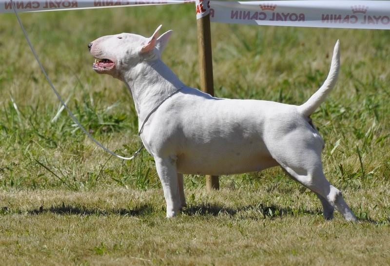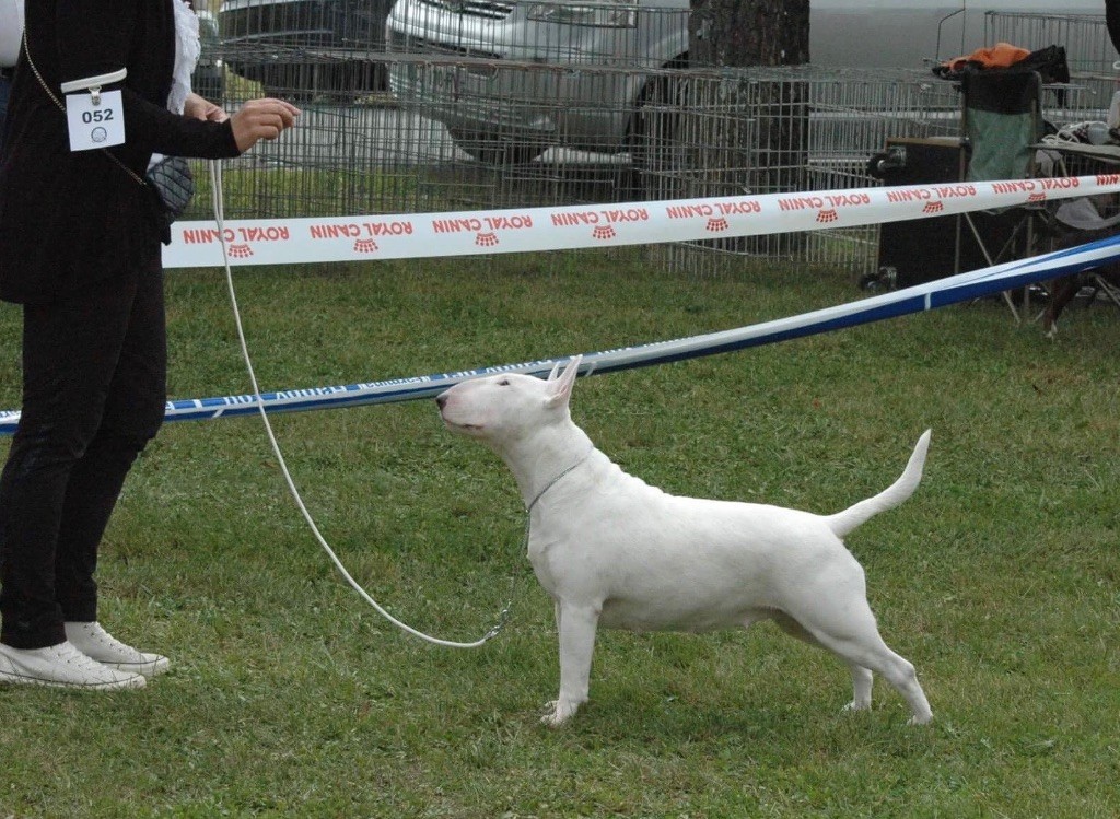 Bon profil avec Bon "Roman finish" (Cassure du bout de nez typique du Bull Terrier)Jolies oreilles Excellent petits yeux Bonne poitrine avant et ligne de dos Bien Angulée à l'arrière Marche serrée avant et arrière