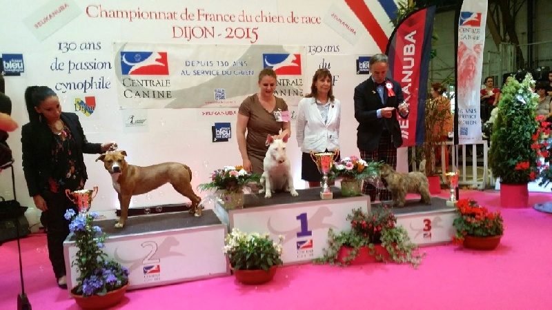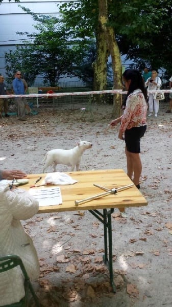 Femelle blanche de 2ans, excellent tête et expressionDenture ciseau, épaule pourraient être mieux inclinéesExc ligne de dessus, angulation arrière, port de queue Serre avant et arrière