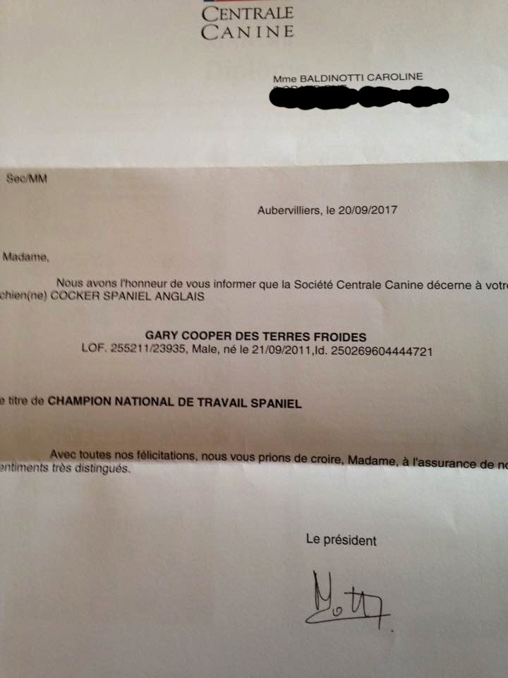 Cooper est un chien incroyable. D'une intelligence hors norme, passionné à la chasse depuis sa plus tendre enfance, c'est lui qui nous a mis le pied à l'étrier, et nous a fait nous passionner pour les fields et le travail du cocker. Nous travaillons tous les deux en parfaite entente, et à présent, en plus de chasser pour lui, il chasse et rapporte pour moi. Il a un contact au travail incroyable, ne sort jamais de ma main, et a le HEP inné.Un immense bonheur ! En plus d'être un très grand chasseur, Cooper est un chien extrêmement agréable à vivre à la maison, toujours obéissant et qui sait être calme quand il faut.Le cocker parfait ! Les copies des tests ADN de Cooper sont disponibles sur la page d'accueil, dans l'onglet Téléchargement.