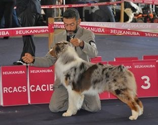 20 mois, sujet bien dans le type, bien construitTete : exc proportions, DCC, exc pigmentation, belle expression, stop bien marqué, Exc oeil Forme, Exc port d'oreillesCoprs : exc dos / rein / croupe, exc ang Av /Ar, membres parfaitement d'applombs, exc ossature, bien charpenté, exc piedsExc couverture, exc couleursAllures faciles, aiséesExc caractère