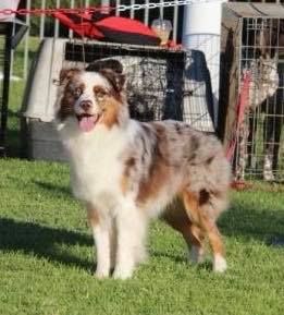 DCC, Rouge MerleExc construction et gabarit, belle ligne de dessus, jolie tête ,encore un peu légère mais en harmonie avec l'ensembleExc rapport Crâne / chanfrain, oeil un peu rondTB attache et port d'oreilles, ossature un peu légèreTB Av main et poitrineexc Ar main, belle croupeBelles Allures de profil