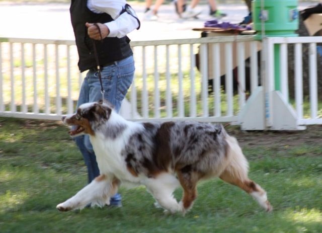 very nice type, strong head wit little bit too much stop good expression, nice topline, stil little light in body and needs more angulation in front and behindexcellent texture of coat but not in good coat today, moves little close in front when looking from side