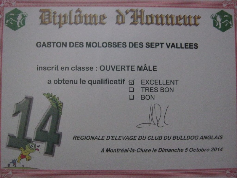 forte ossature, excellent dessus de crâne avec oreilles en roses bien plantées, prognathisme correct,forte encolure, ?il un peu clair, exc aplombs avant, poitrine bien dessus, exc aplombs arrières, exc allure, exc caractère, bonne présentation