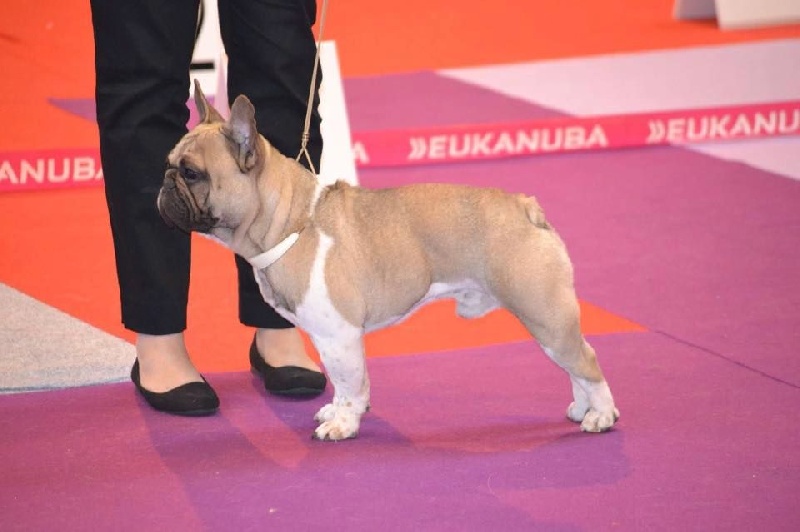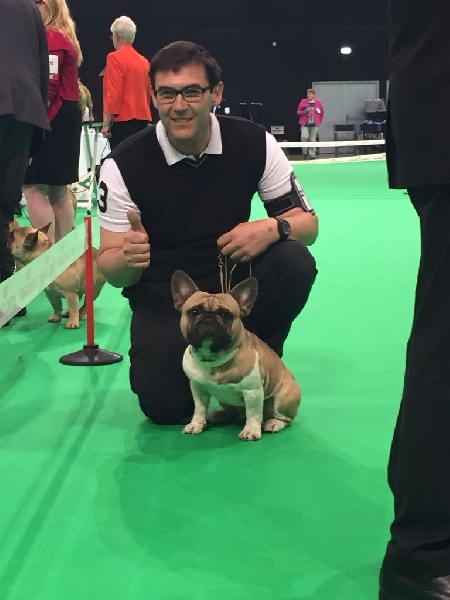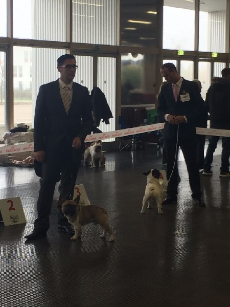 2 ans Exc caractère typique de la raceTB formatchien compacttête puissante avec une EXC expressionTB oreilles potées un peut écartéExc oeil foncé TB ligne de dessusExc queuepoignet un peu faible pied qui pourrait être un peu plus compact AR AV correctRein courtAllure dégagées AR main qui pourrait avoir plus de poussée