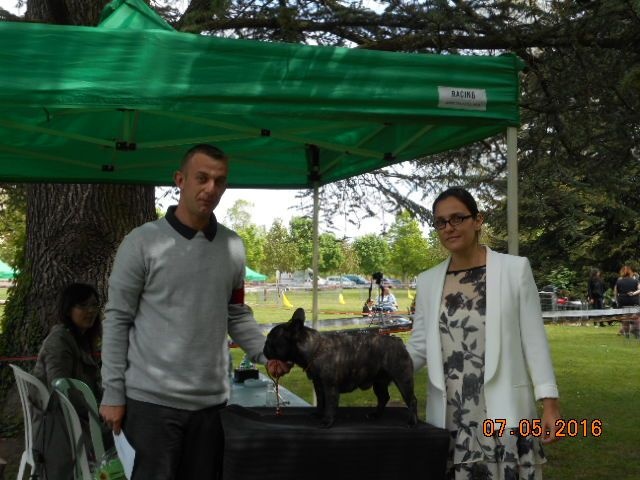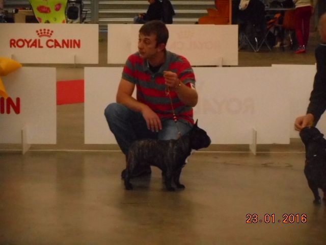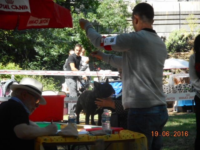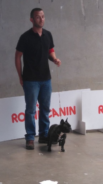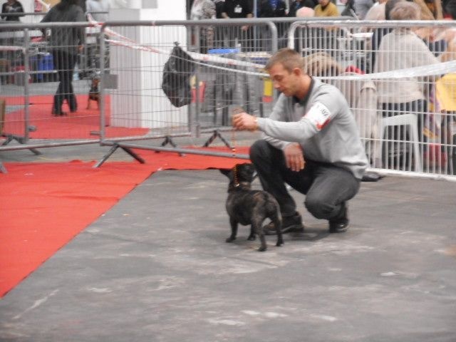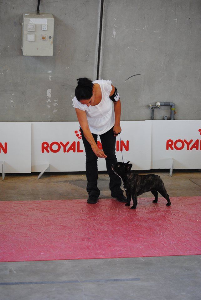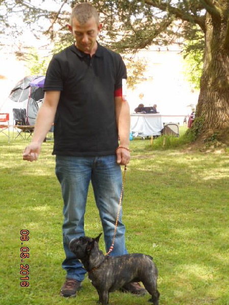 bringé noir-bonne pigmentation ongles-feminine et harmonieuse-excellente tête et expression-excellentes proportion oreilles et crâne-yeux bien ronds ,un peu grand-truffe bien proportionnée-narines bien ouvertes-bon plis-excellente lèvres et menton-De face:excellent sujet,poitrine large et descendue.bonne ligne de dos-queue un peu haute-hanches large et musclées-angulations avant correct-angulations arrière un peu raide-mouvements fluide.