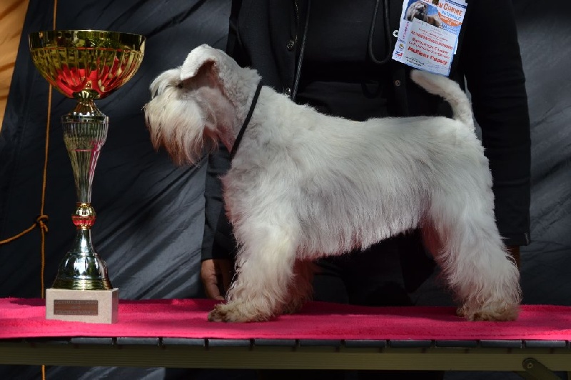 tête très bien construite, manque un peu de volume, exc oeil exc pigmentation muqueuse, oreilles bien placées et bien portées, exc poitrail, poitrine, et attache de queue, exc ossature aplombs et pieds, tres bonne qualité de poil se déplace bien, très bon caractere et présentation
