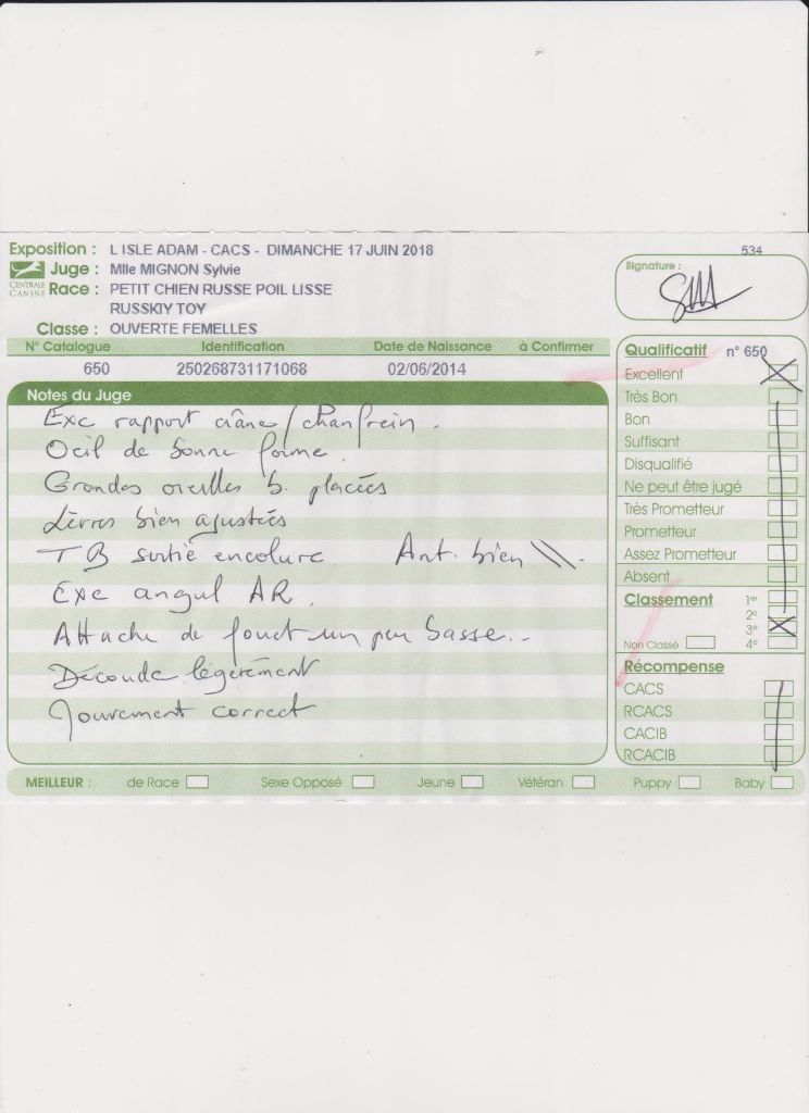 Très bonnes proportions , Tête bien typée sèche , ?il bonne forme et couleur , Expressif , Dents correctes , Encolure longue , Dos pourrait être plus ferme , Coudes légèrement décollés du corps , Ligne de dessus correcte , Très bonnes angulations , Très bon mouvement .