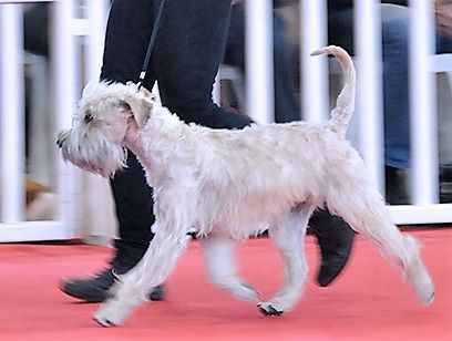 16 mois - Bonne taille - jolie tête - Bien construit - jolie ligne de dos - correctement angulé devant et derrière - pas en condition optimale de poils - Mouvement devant pourrait être plus parallèle - derrière Ok AVIS DE L'ELEVEUR : il est impossible de mettre un jeune chien aux allures, sur un simple aller-retour, dans un ring qui est grand comme un mouchoir de poche !!! Pas digne d'une Nationale d'Elevage !!!