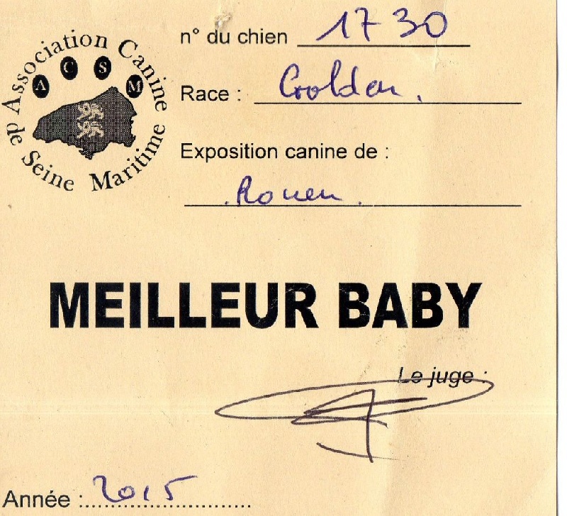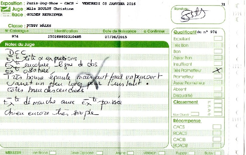 Tares oculaires - indemne (09/08/2017)Hanches - C/CICT-A - Hétérozygote (porteur sain)GR-PRA1 et 2 - normal/clearCoudes - 0/0