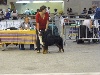 2 yeras and 3 months old. Type : feminin marks, very strong female, coat correct. would like darker tan (?). good behaviour. good temperament. strong head. good muzzle. correct proportions. correct eyes, ears, closed fitting eyelids and lips. strong neck. correct bite and teeth. compact topline. correct croupe and tail. good chest and forchest. Movement : little open in elbows and tooiing in (?) Correct tail. Good bone