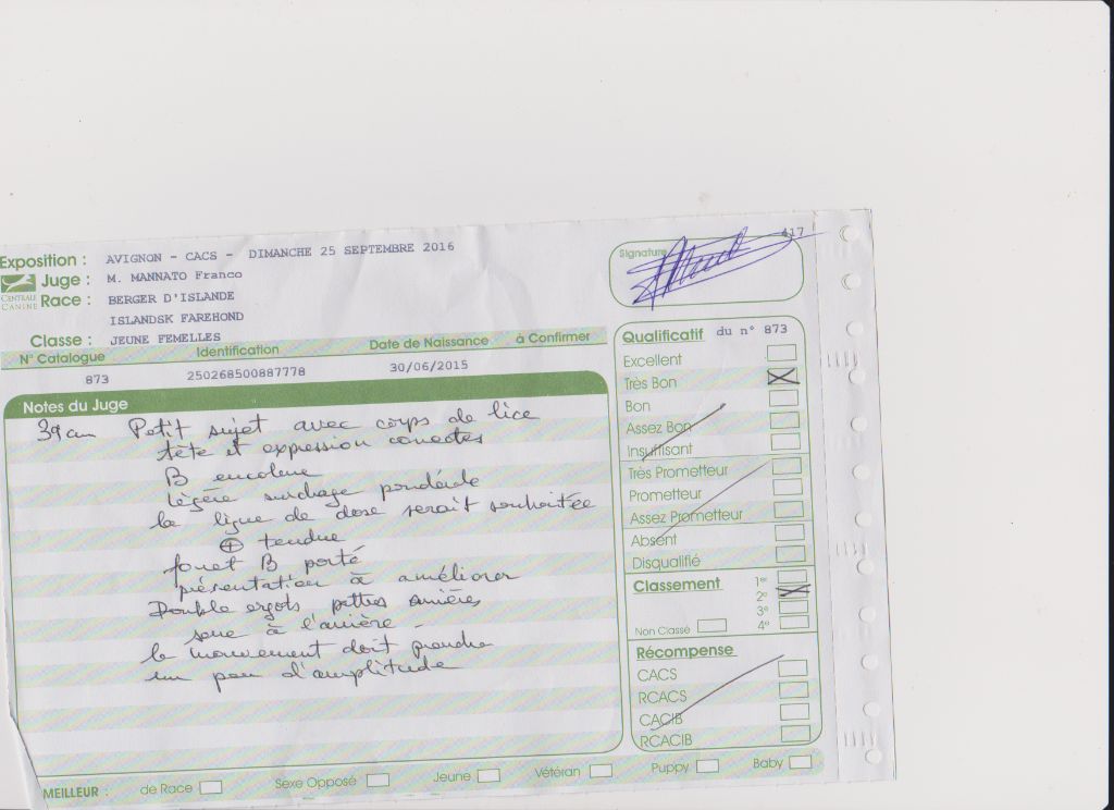 Ergots - Doubles ergots aux pattes arrièresDentition - ComplèteTares oculaires - Un pli rétinien non évolutif, non handicapant. La reproduction nHD (dysplasie hanche) - D/C