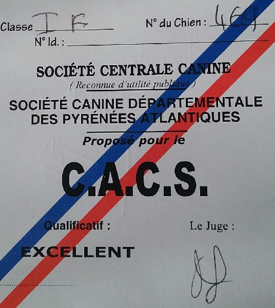 "Excellent chien. Denture parfaite. Excellent crâne. L' oeil est foncé important. Les oreilles compatibles. Le nez est bien remouché. Construction correcte. Excellentes épaules. Excellente ossature. Excellents aplombs et pieds et poitrine. Excellent roach back bien marqué. Angulation des postérieurs correcte et fouet. Serre un peu"résultats 1er excellent - CACS
