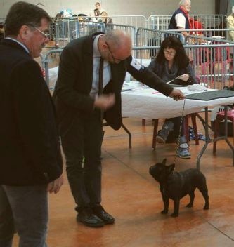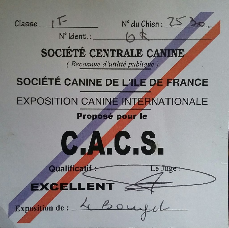 "Excellent sujet, excellente ligne de dessus et de dessous, belle encolure, queue présente bien placée, belles angulations avant et arrière, excellent crâne, oeil bien plein, excellent remouch?, rides bien placées, excellent prognathisme, excellente démarche. QUALIFICATIF EXCELLENT. "