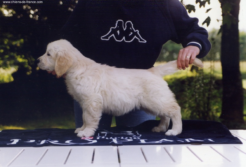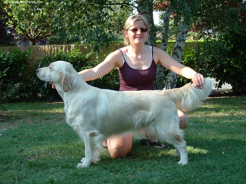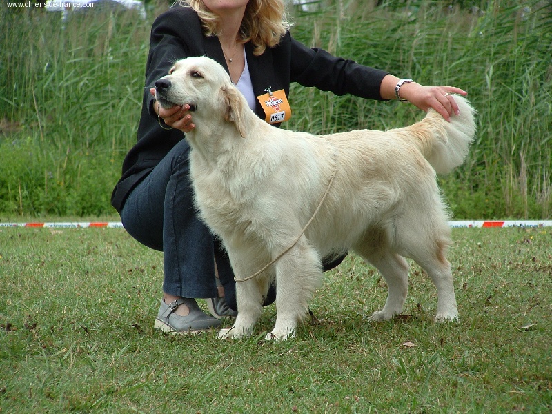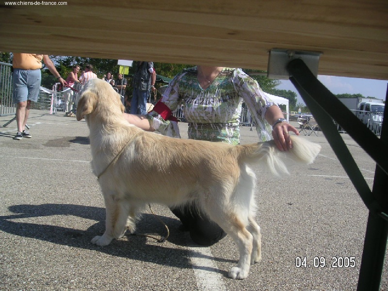 joli modèle féminin, harmonieux, bien construit. Jolie tête féminine, expression douce, bonne sortie d'encolure. Exc angulations, aplombs et pieds. Exc ligne de dessus.Superbe qualité et texture de poils. Mouvement ample et élégant