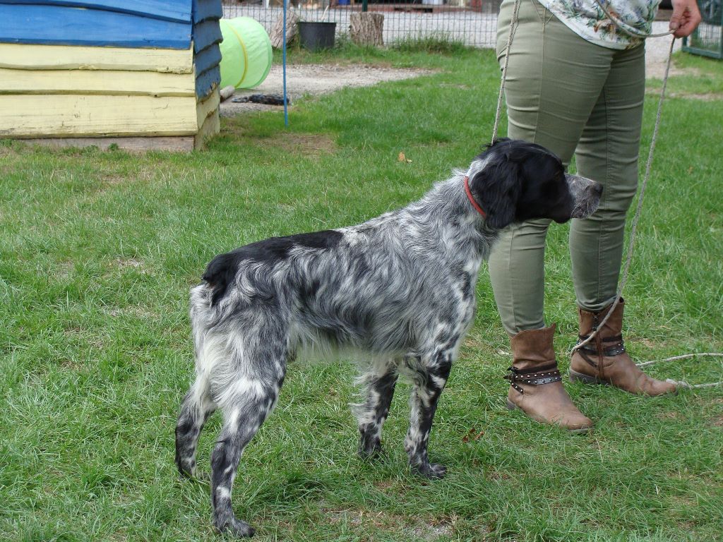 Chien un peu long, bonne ligne de dos et attache de queue, poitrine bien descendue, bon poitrail, Très bonne ossature, très bonnes angulations, bonne sortie d?encolure, tête dans le type mais un peu grossière, demanderai plus de sculpture ? Excellente démarche, souple et régulière, Excellente prise de terrain1er Excellent RCAC
