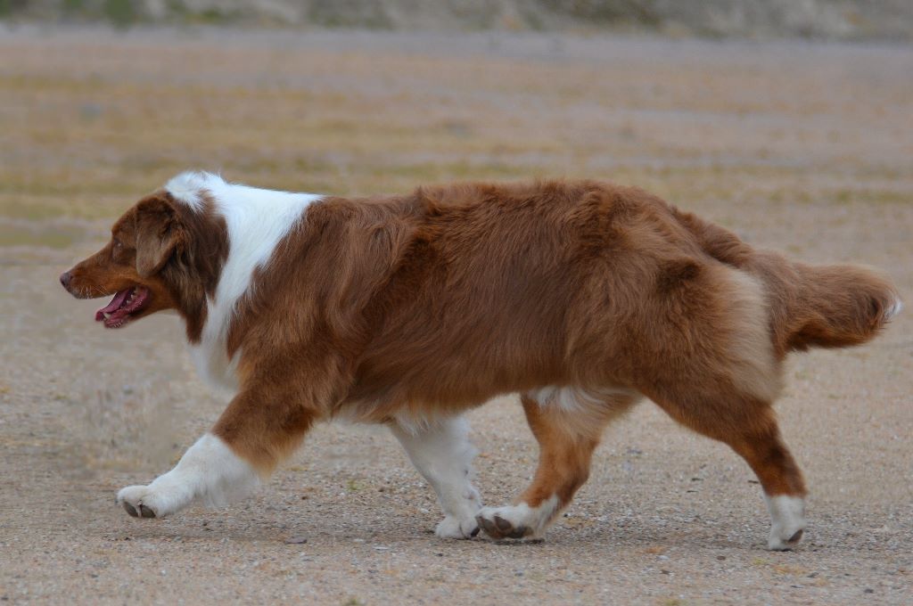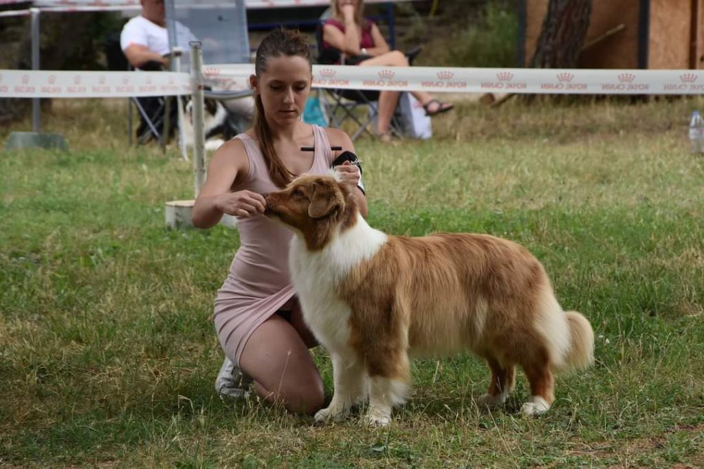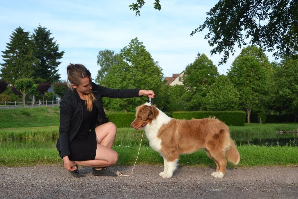 3 ans sujet bien proportionné mais manque de typeTete: excellente constitution, un peu lourde Très bon port d'oreilles DCC Excellent pigmentation/ forme d'yeuxCorps: Très bon dos/rein/croupe un peut d'embonpoint Très bonne angulation avant et arrière Ossature correcte Excellente couverture/couleur Membres parfait d'aplombsAllures à travaillerExcellent Caractère