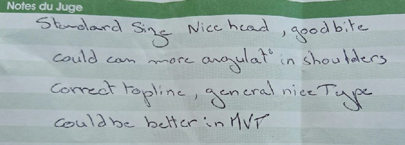 Exc dentition Exc tête Belle proportion Belle oeil Exc ligne du dessus Très bonne angulation arrière Très belle épaules Avant bien droit, aplomb correct Bon mouvement