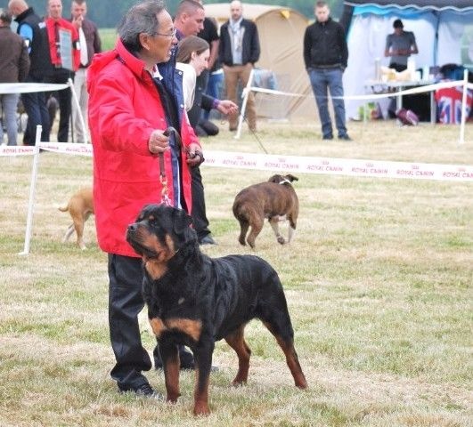 tête TB construite , oeil foncé , Dcc, petites oreilles bien placées , poitrail poitrine en place bien implantation et port de fouet , ossature forte , ant.un peu ouverts à l'arrière, poil à tendance à onduler un peu , se déplace correctement , tres bon caractère et présentation