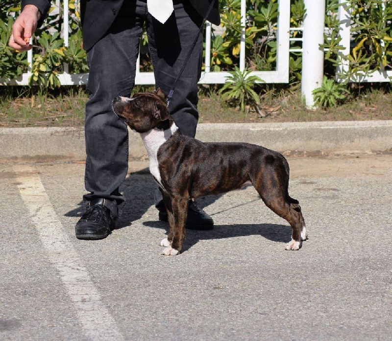 Pour sa première exposition, Jewel nous fait la joie de terminer 2ème Excellent sur une classe de 7 femelles, avec d'excellents commentaires du juge :Femelle bringée et blanche, 20 mois. Excellente tête, très bonne expression, très bonne épaule, excellente ligne de dessus, excellentes angulation arrière et excellent port de queue. Très bon mouvement, excellent caractère. Enfin une femelle bien musculeuse !