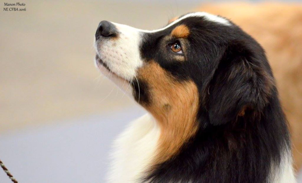Tricolore. Tres jolie tête qui est la seule partie épargnée pas la mue. Exc angulation et présentation. Je l'aimerais 1 peu plus longue. Exc foulée