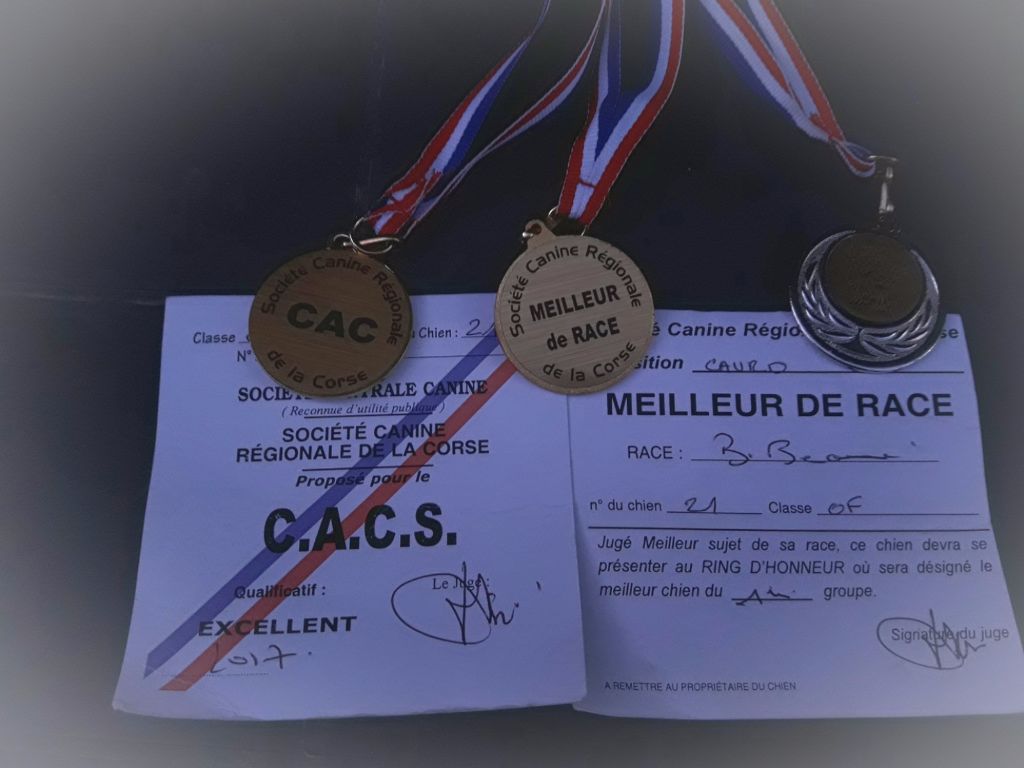 Excellent sujet dans l?ensemble général, Bonne tête bien typé, Bonne couleur, Bonne dentition, Museau bien remplis, Encolure solide, Ligne de dos légèrement poussé en statique, Excellent pieds bien serrés, Feux excellent foncé et légèrement charbonné, Excellent manteau, Bien entretenu, Excellente démarche, Aplombs corrects, Bien présenté.