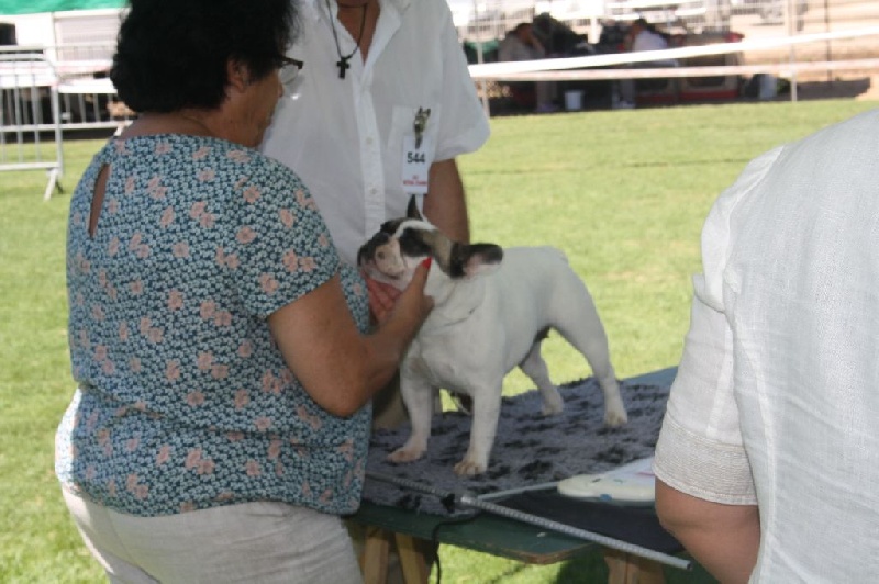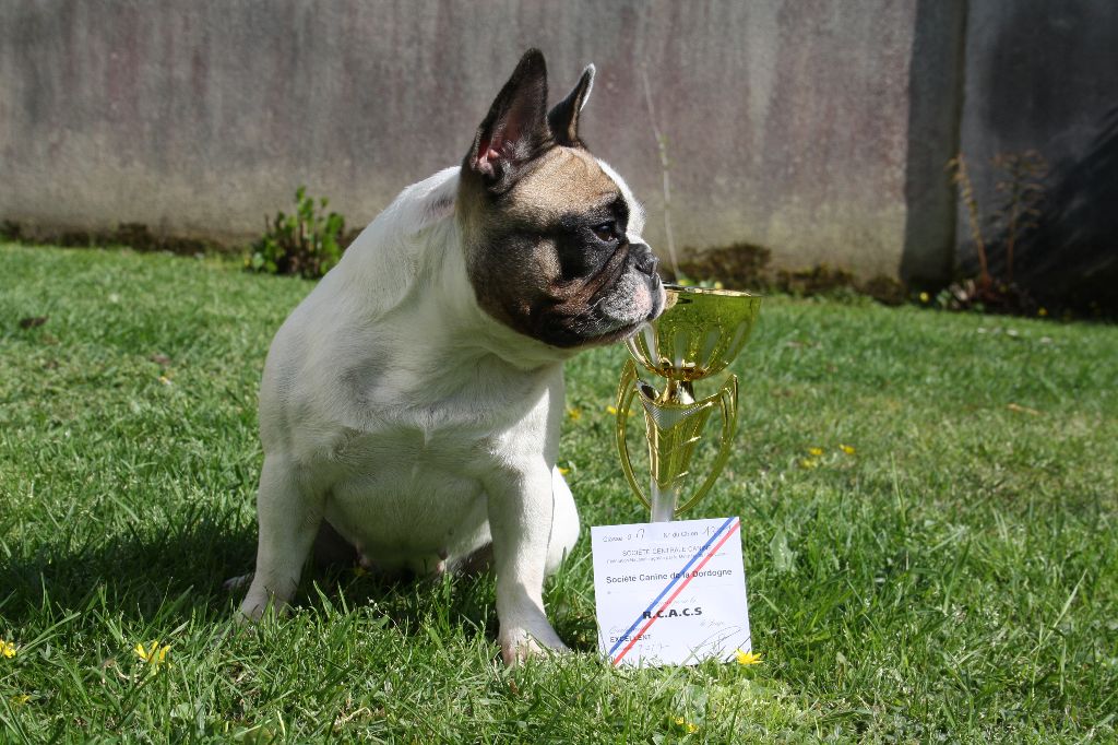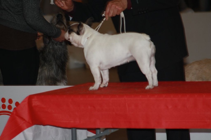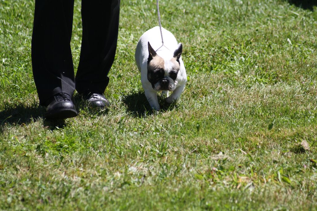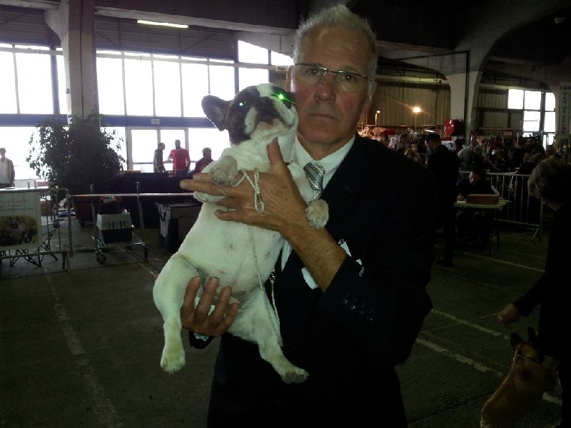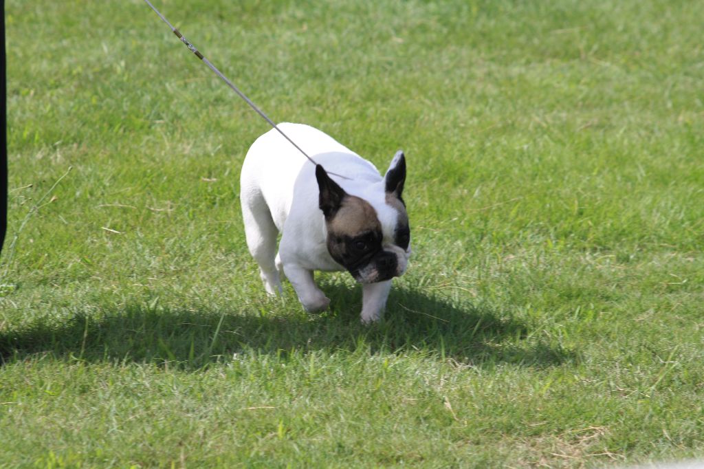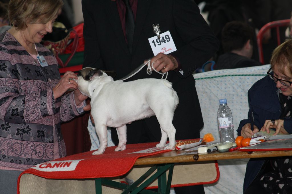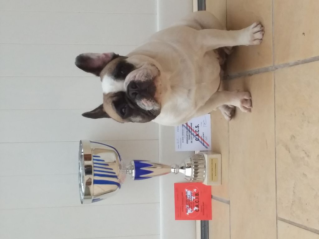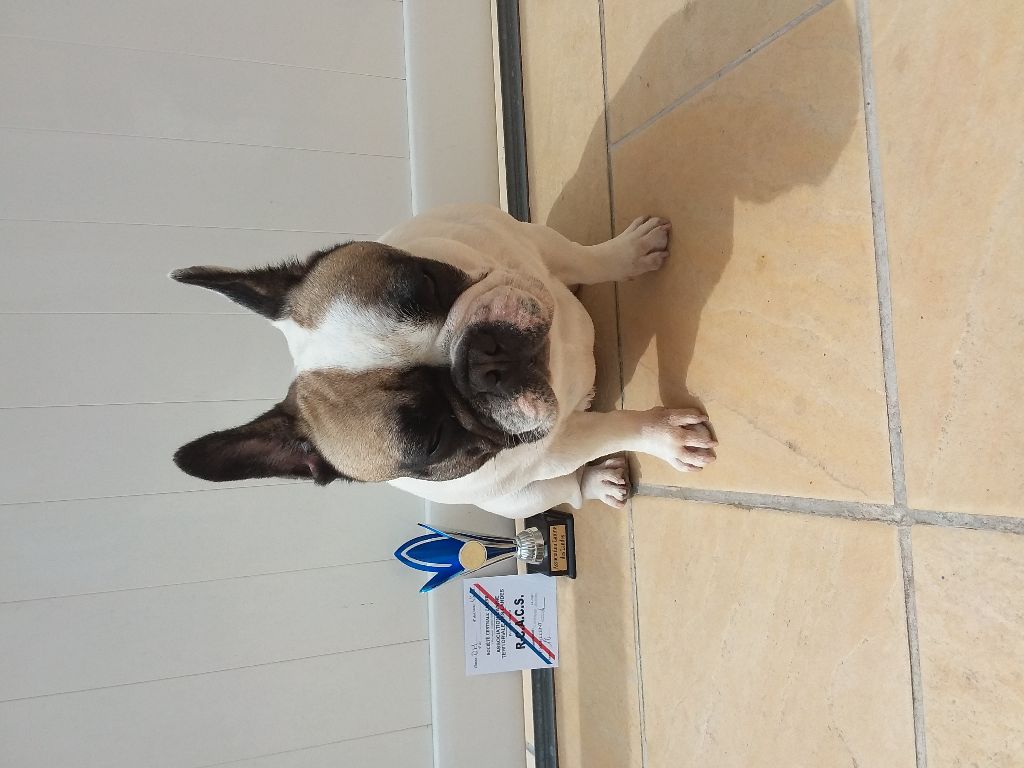 Excellent stop crâne et chanfrein ,narines bien ouvertes , oreilles bien insérées , oeil bien foncé , excellent prognatisme ,mériterait d'avoir un peu plus de menton ,Roack Back bien marqué ,queue bien insérée , bonne longueur , très bon antérieurs et postérieurs , très bonne couleur , marche à parfaire .