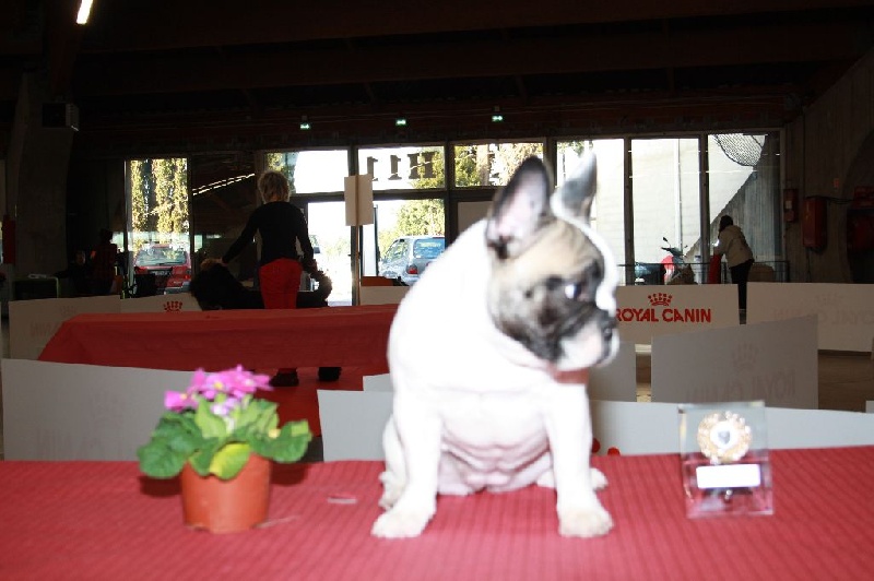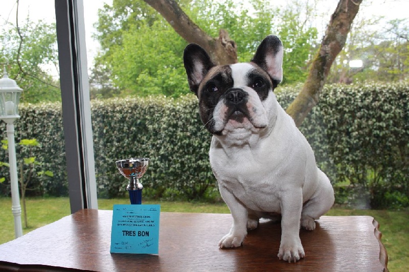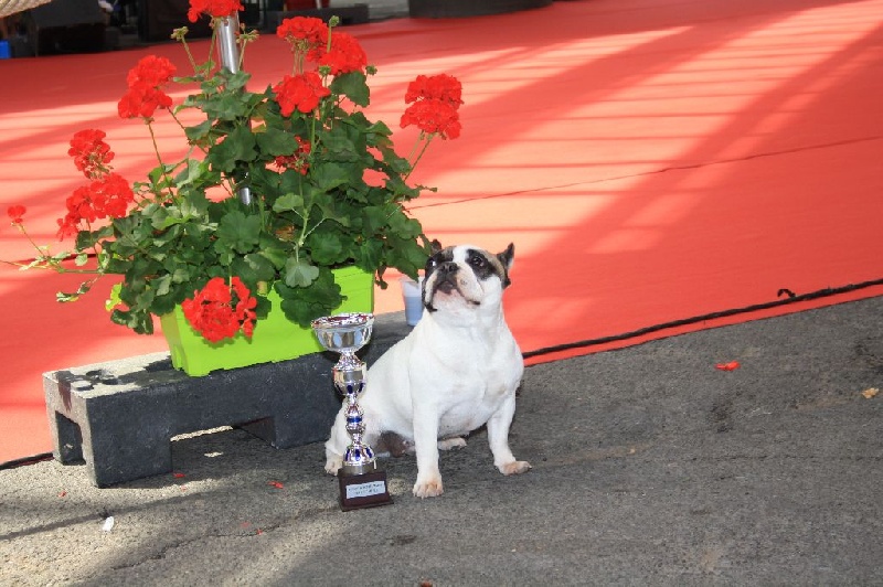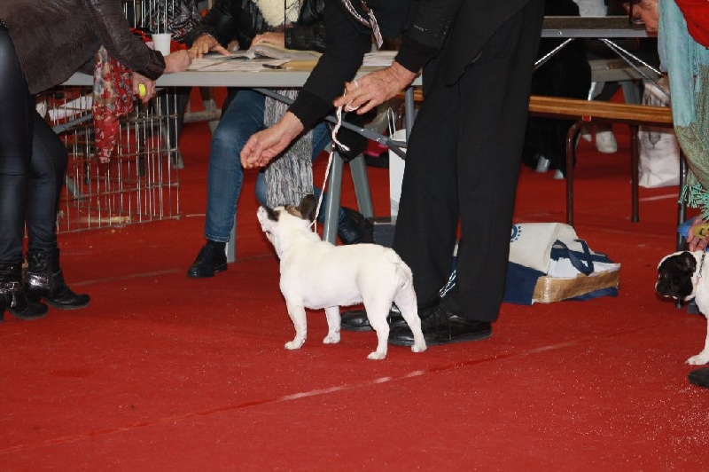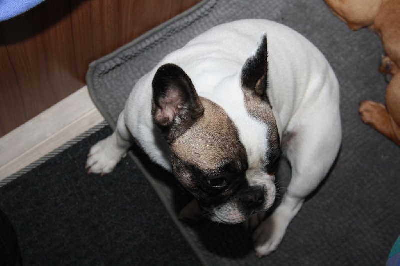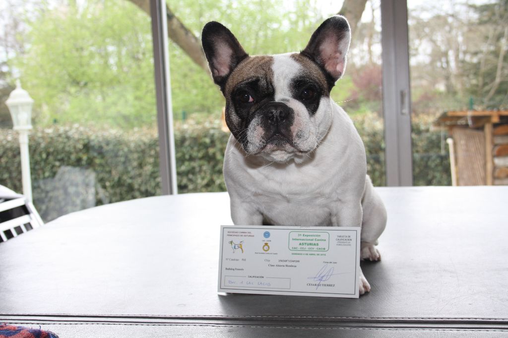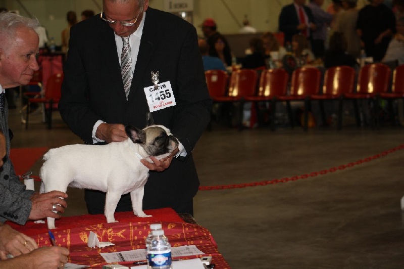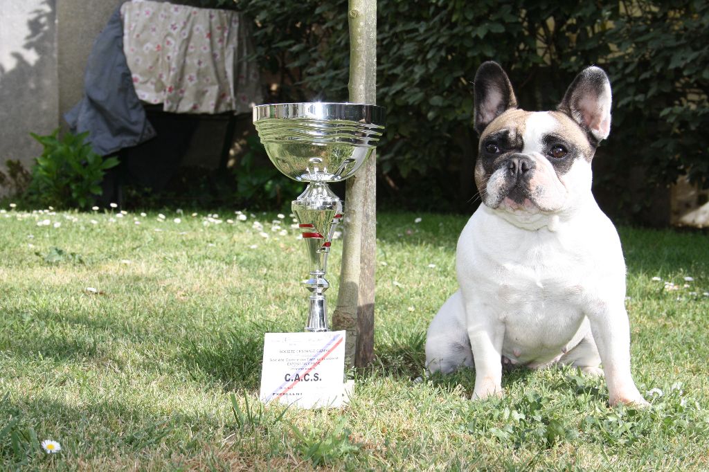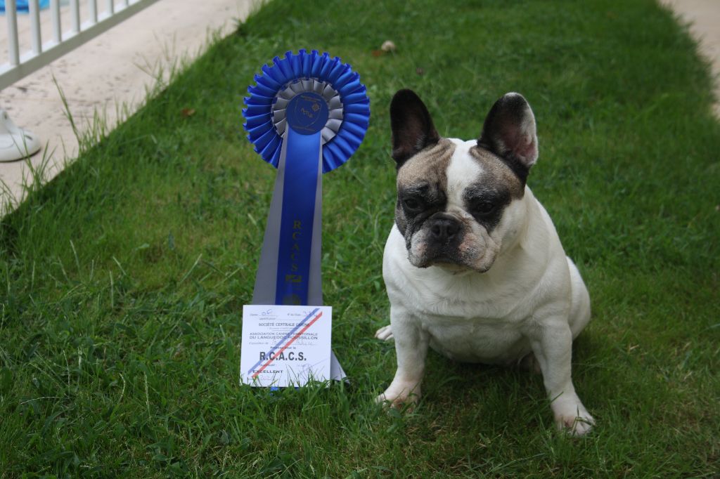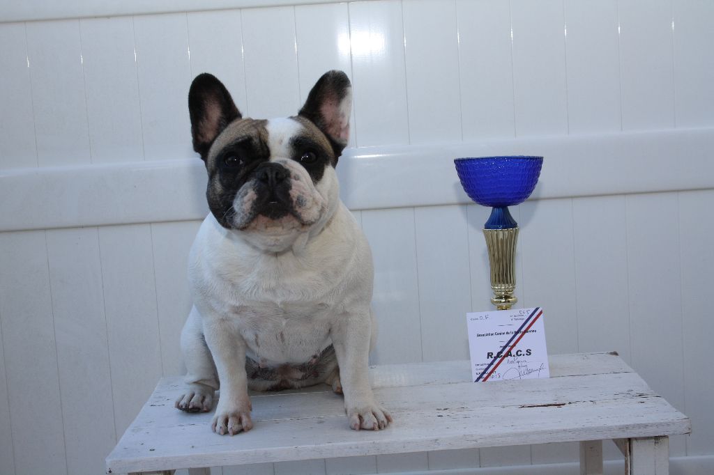 Excellent stop crâne et chanfrein ,narines bien ouvertes , oreilles bien insérées , oeil bien foncé , excellent prognatisme ,mériterait d'avoir un peu plus de menton ,Roack Back bien marqué ,queue bien insérée , bonne longueur , très bon antérieurs et postérieurs , très bonne couleur , marche à parfaire .