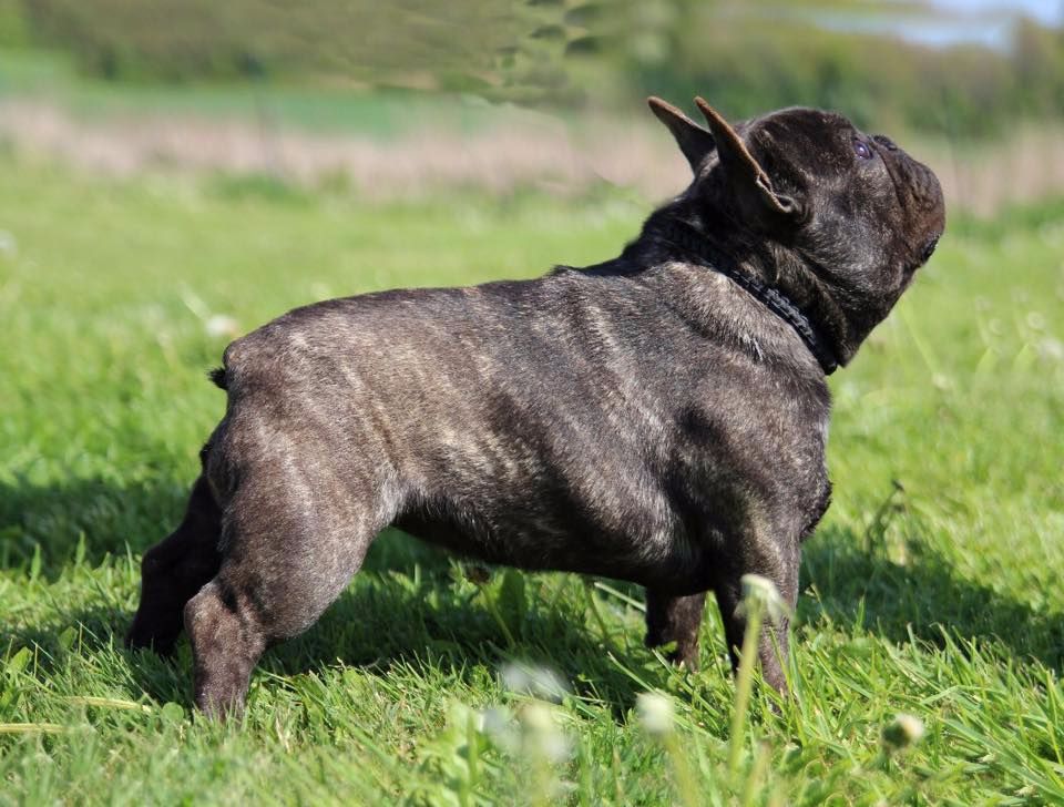 Bien construit, mouvement correct, se présente bien, bon crane, oreilles pourrait mieux portée, oeil ex, ride correcte, narine ouverte, bonne lèvres, bon prognathisme, bonnes épaules, ossature correcte, poitrine bien éclatée et solide, queue 1 vertèbre, ex musculature, ex couleur et bringures/robe.