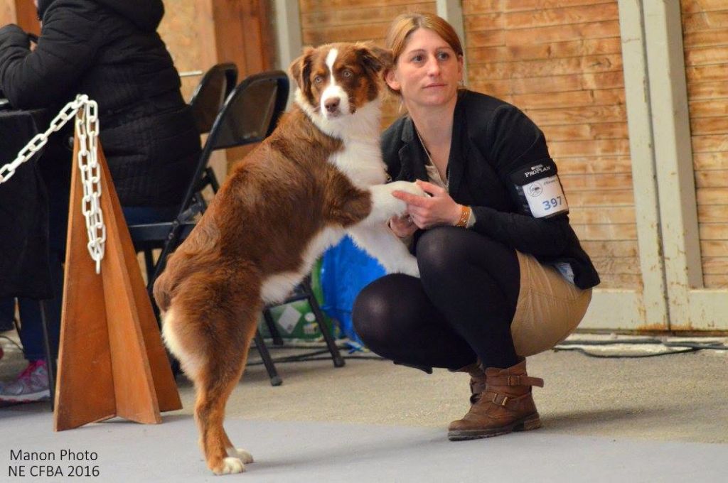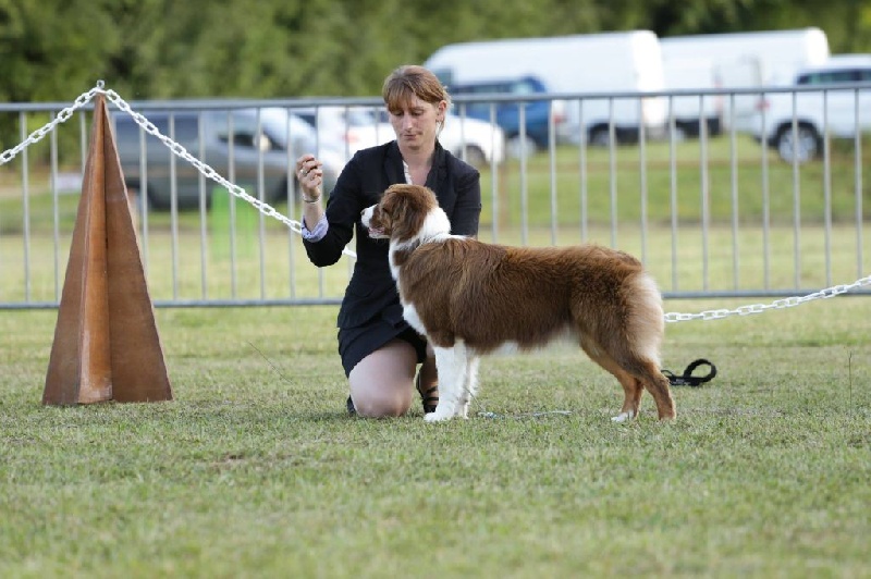 DCC - RT - Joli tête féminine - Exc paralellisme - Exc stop - Joli bout de museau - Bonnes proportions -Oreilles bien portées - Exc yeux - Exc poitrail - Encolure moyenne - Ang en équilibre - Dos ferme - Exc croupe - Rein un peu long - Exc ossature - Pied compact - Bonnes allures manque un pêu de poussée arrière