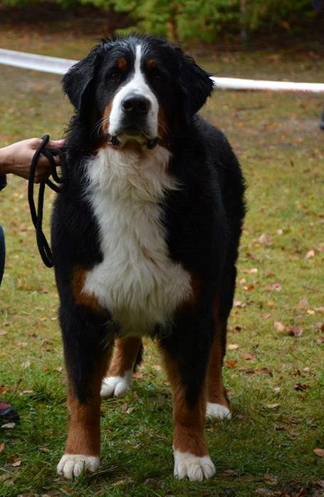 Tête tres bien construite oeil fonçé, poitrine en place, ossature forte bien en accord avec la silhouette. TB qualité de poil. Se déplace bien TB caractère et présentation.