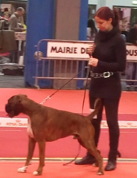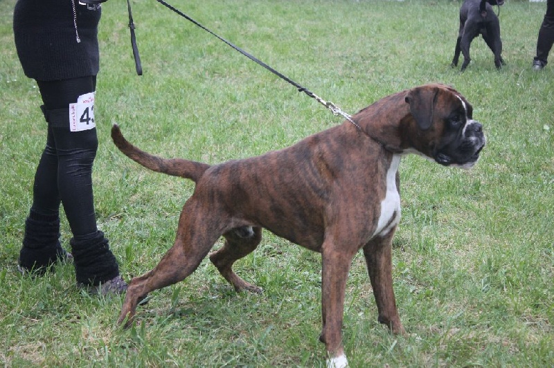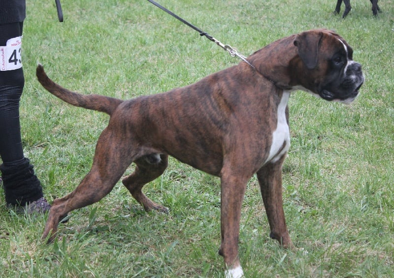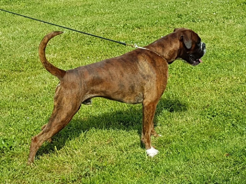 Carré - montant - bien angulé - puissant - belle encollure - superbe tête - crane bien ciselé - bel oeil et expression - museau bien cubique - machoire bien recourbée - prognathisme normal - grand dans la tolérance - yeux très foncé - Belle robe bringé