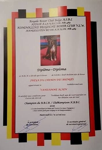 Avec ses 4 nationales de gagné sur 5 ans en Belgique ,FREYA est devenue Championne du Royale Boxer Club Belge, seule femelle française à avoir ce titre...