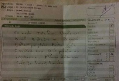 Taille moyenne régulièrement bringée s/cuivre marquée en blanc, très bon type de tête, au crâne bien formé,bon stop (le volume du museau est en rapport , la denture est moyenne large et régulière, yeux sombres,pratiquement carrée, belle ossature, belles angulations AV/AR, l'encolure est presque sèche, un bon dos, belles allures régulières..