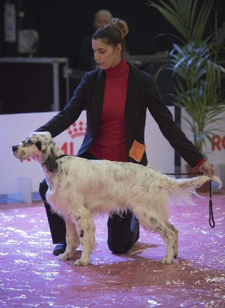 DCC. Dans le type. Inscrit dans un rectangle.Exc tête, oeil et oreilleBelle sortie d'encolure.Exc dessus et ar main.La poitrine pourrait être plus descendueExc angulations, aplombs, piedBonne démarche