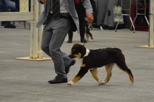 Très bon Type, Beaucoup d'os, Fourrure Tri exc Pigmentation, dcc, Tête expressive, museau un peu fort, oreilles bien portées, une bonne sortie d'encolure, dos un peu faible, Tb aplombs, exc angulation et pieds, exc démarche, allures régulières, dos un peu faible aux allures