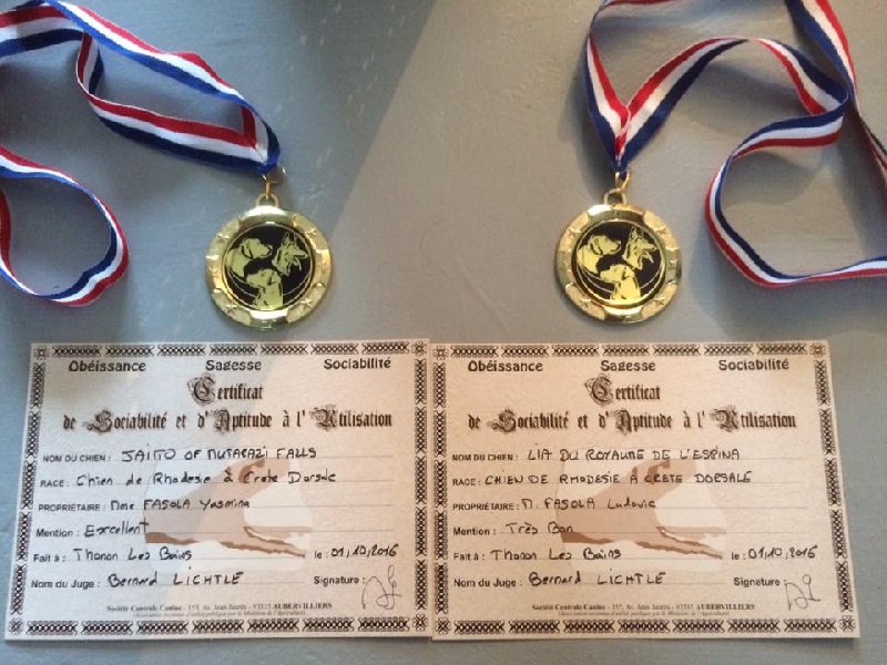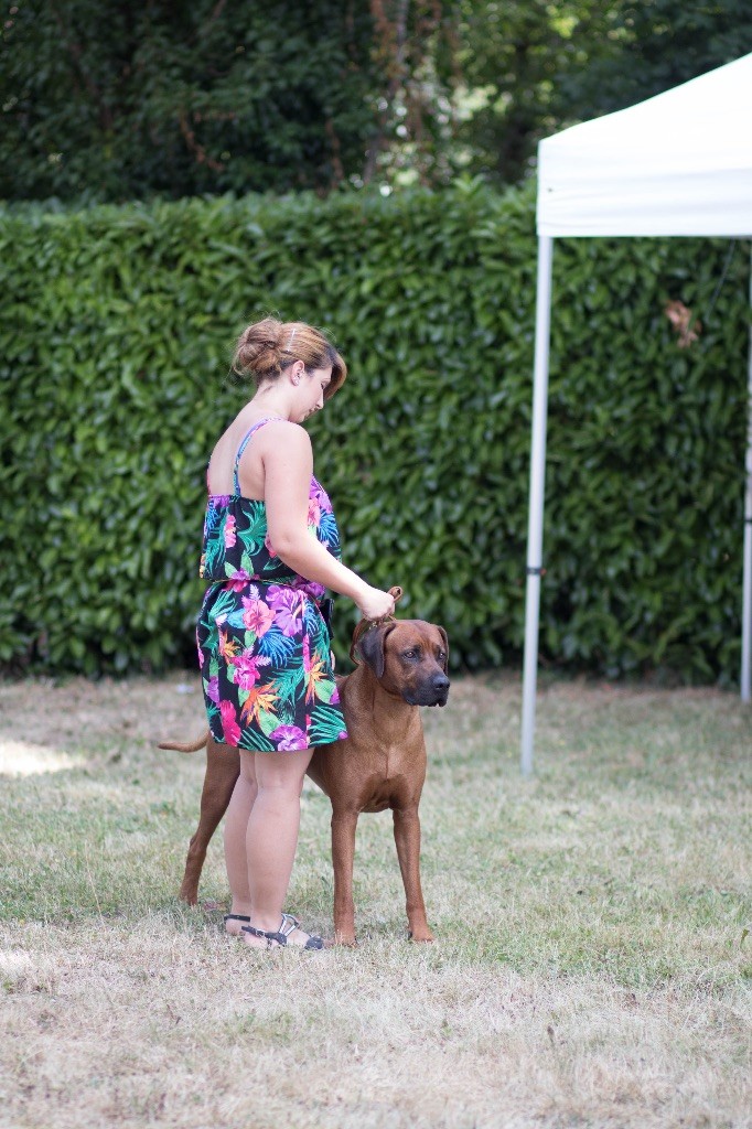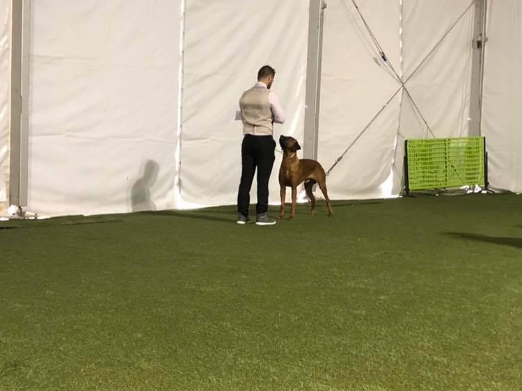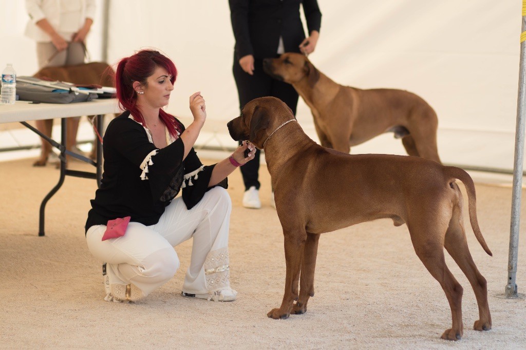 Classe Intermédiaire: Bonne figure, tête masculine. Excellente dentition, excellente ossature, poitrine déjà bien descendue, excellent Ridg avec ses deux couronnes, les membres sont bien dirigés avec excellent aplomb, excellent mouvement et présentation.Récompense: CACS
