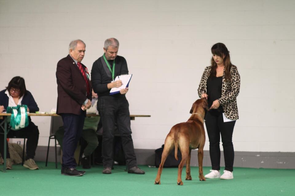 Classe ouverte mâle: 67cm, sujet bien construit, très bonne tête en 3D. Excellentes oreilles. Oeil correcte, excellente ligne de dos et poitrine, ridgs correctes, fouet porté un peu gaiement, sert légèrement des postérieurs à la démarche (sa glissait) Bonnes allures.
