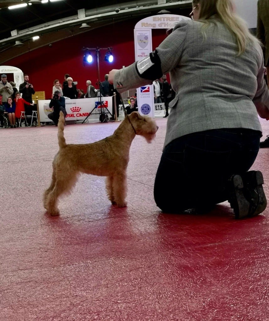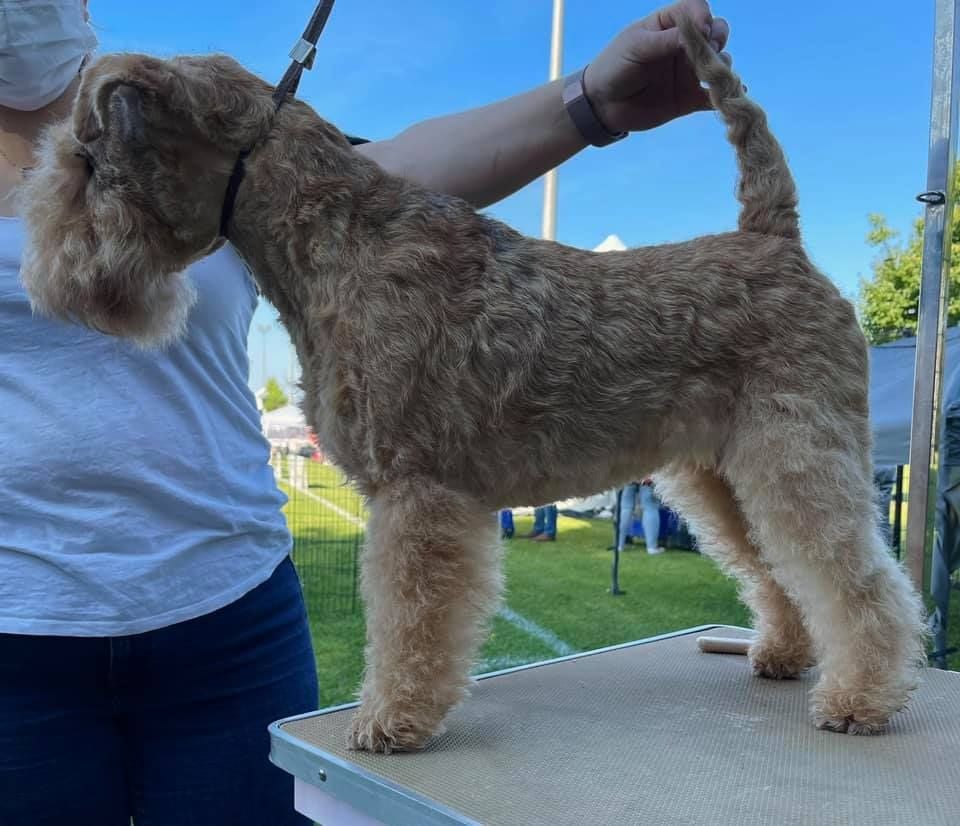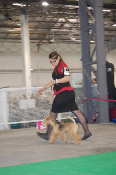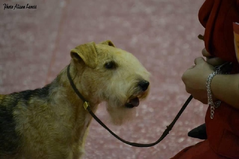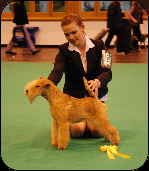 Jolie sujet dans le type et la taille Se présente très crânement, DCC Exc épaule exc arrière mainla poitrine est encore juvénile Ensemble très terrier Exc texture et couleur de poil exc présentation