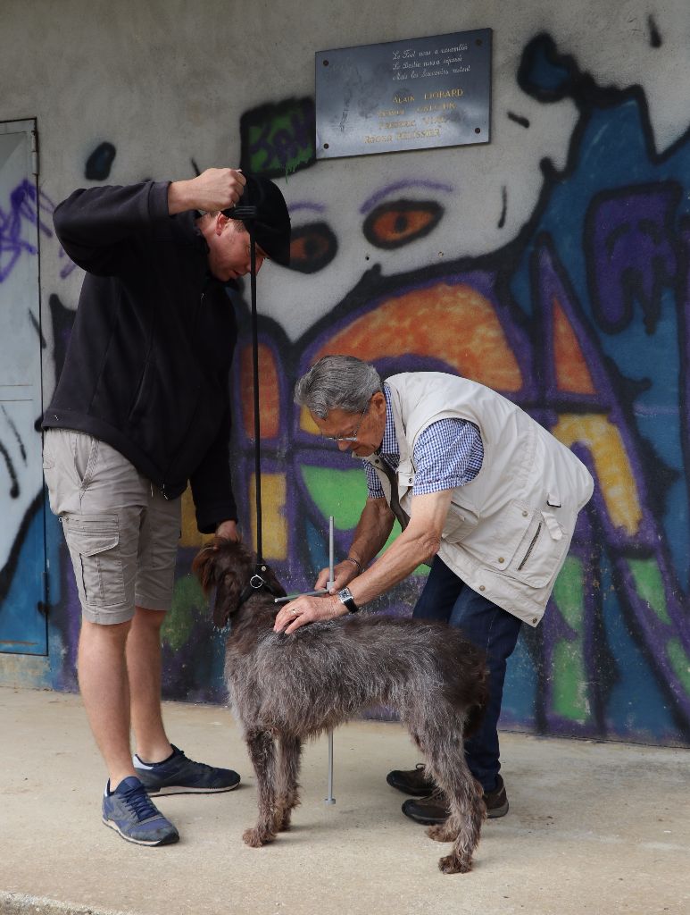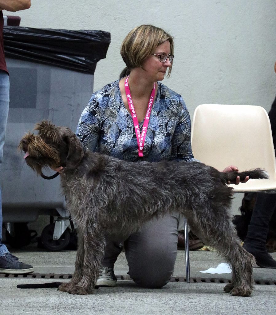 Dentition complète, 6 mois, s'est développée harmonieusement avant-arrière, excellentes proportions d'ensemble, excellent ossature, poitrine déjà correctement descendue, très bons aplombs, excellentes angulations, très jolie tête féminine avec oeil de belle expression, oeil avec pigmentation un peu claire mais en harmonie avec la robe, doit parfaire son poil dur, montre déjà une foulée de qualité avec une excellente mécanique du mouvement.