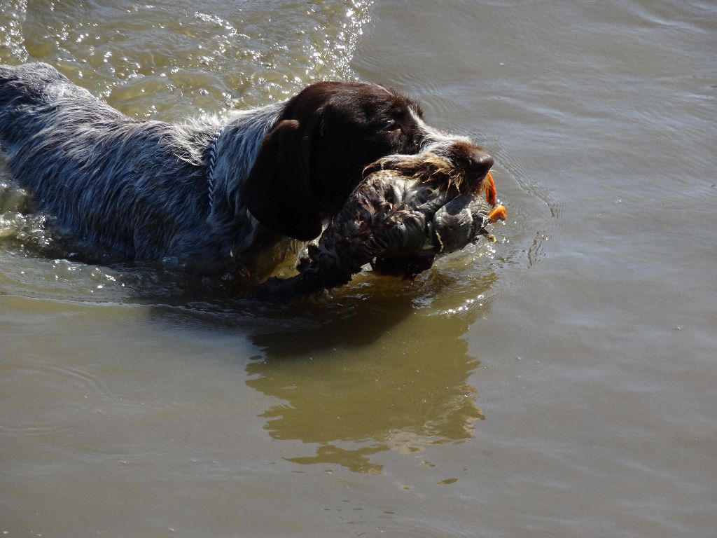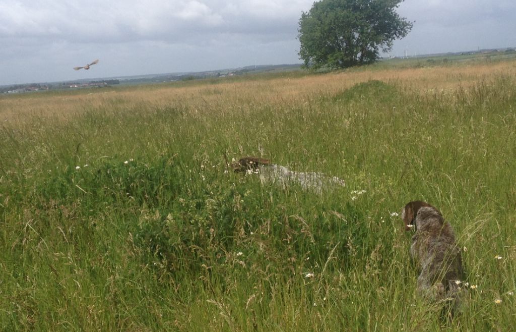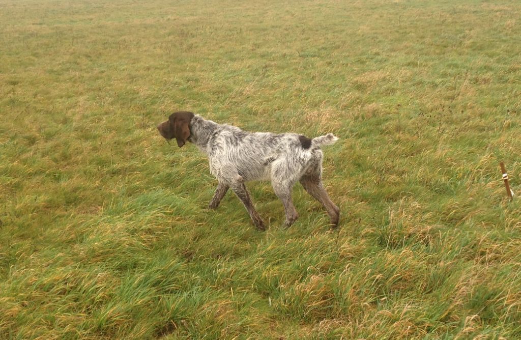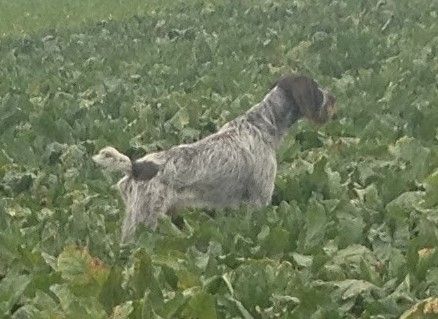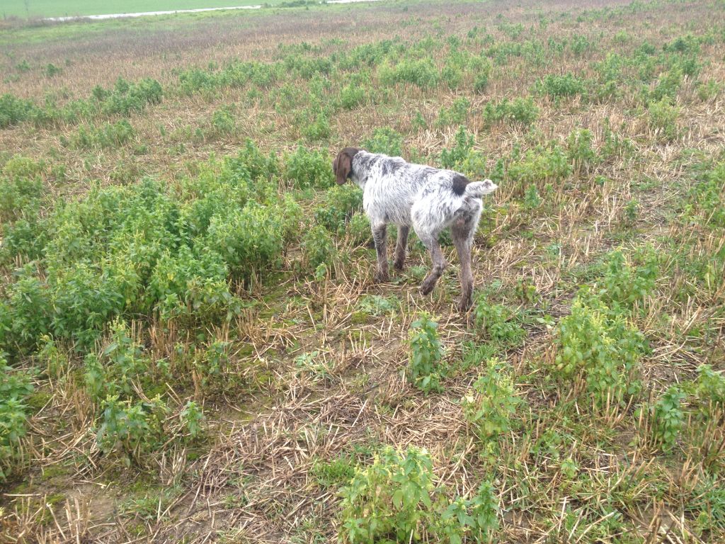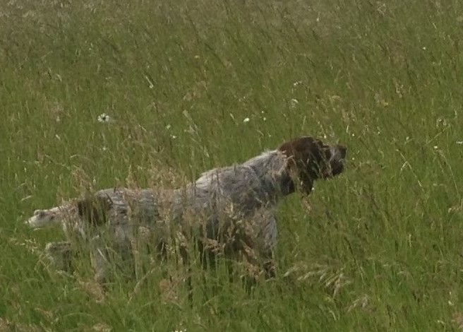 prend un peu de temps avant de s'installer sur le terrain après 2-3 lacet a connaissance d un couple remonte et arrêt je fait couler le couple vol a 80 mètres dans une route de traitement ont continue le chien prend une quête de jeune bien croiser mais a du mal a s'étendre a connaissance remonte et arrêt je fait coule bien droit le nez en l'aire le nez a terre le couple vol a 25 mètres bien en ligne sage envol et feu un travail de jeune a continuer