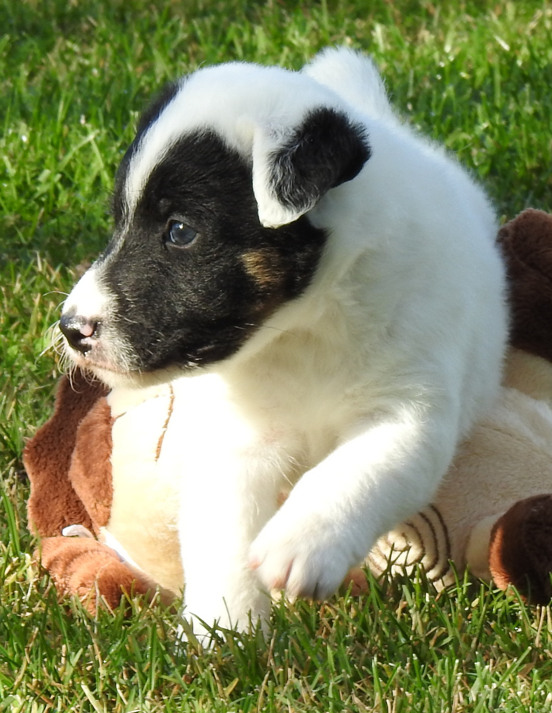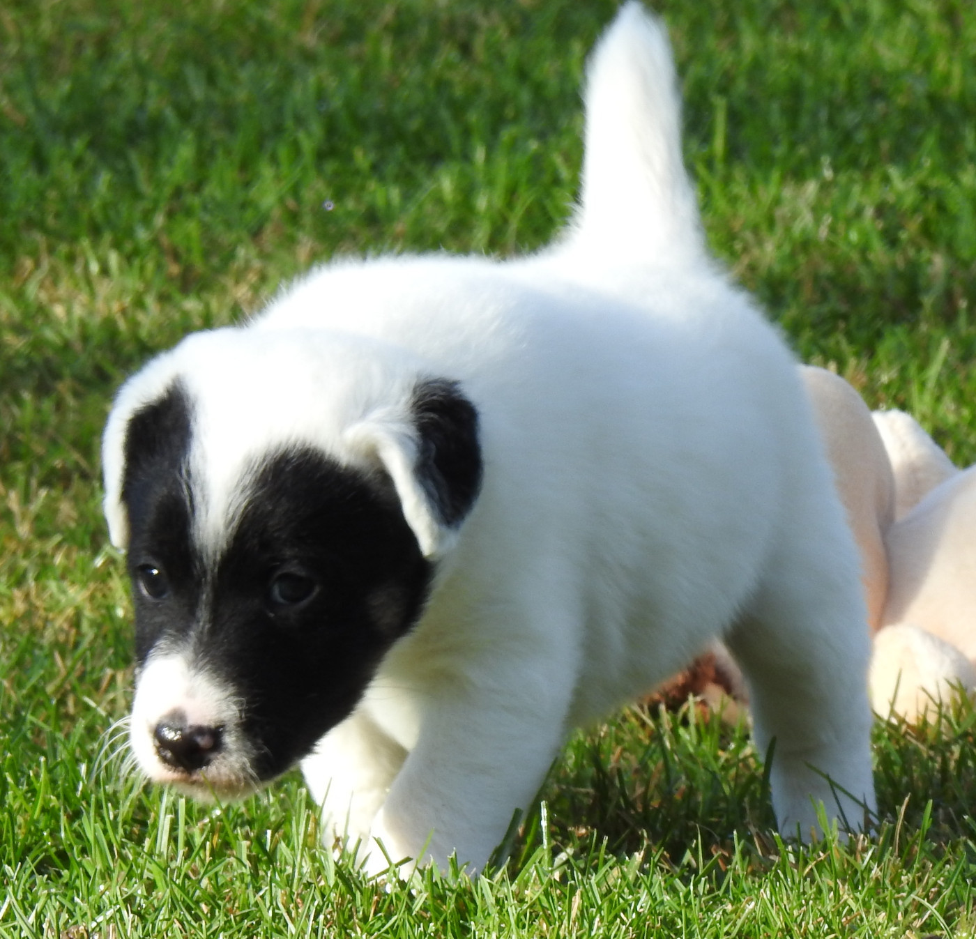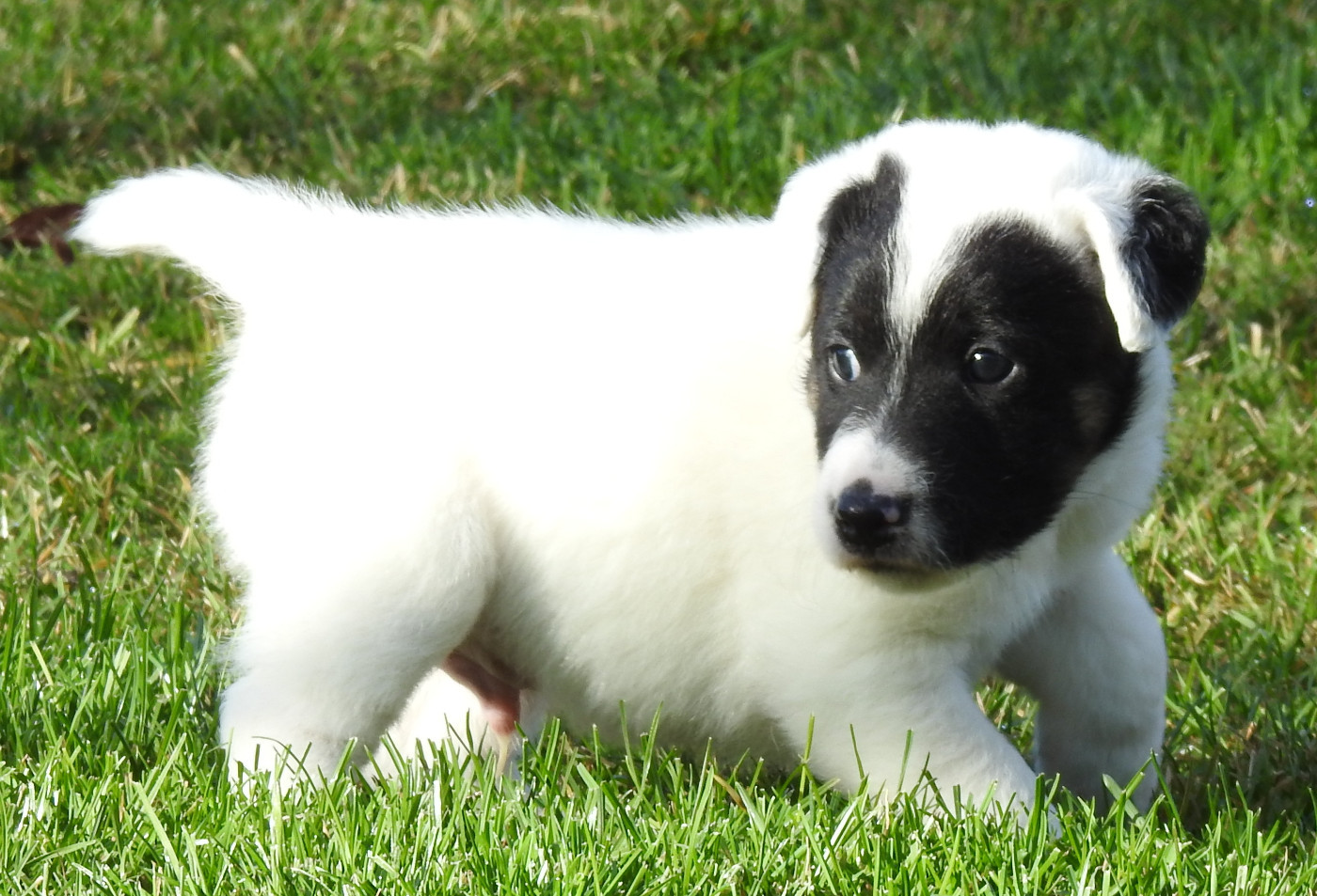 Magnifique chiot mâle avec un marquage marrant noir sur la tête et le corps blanc.