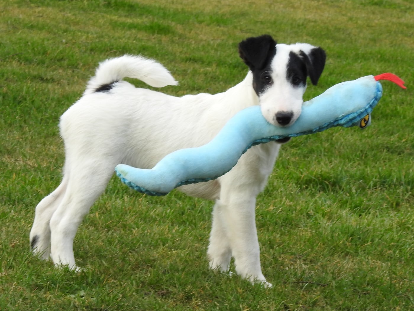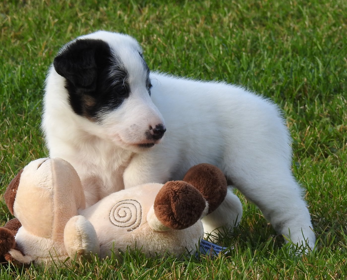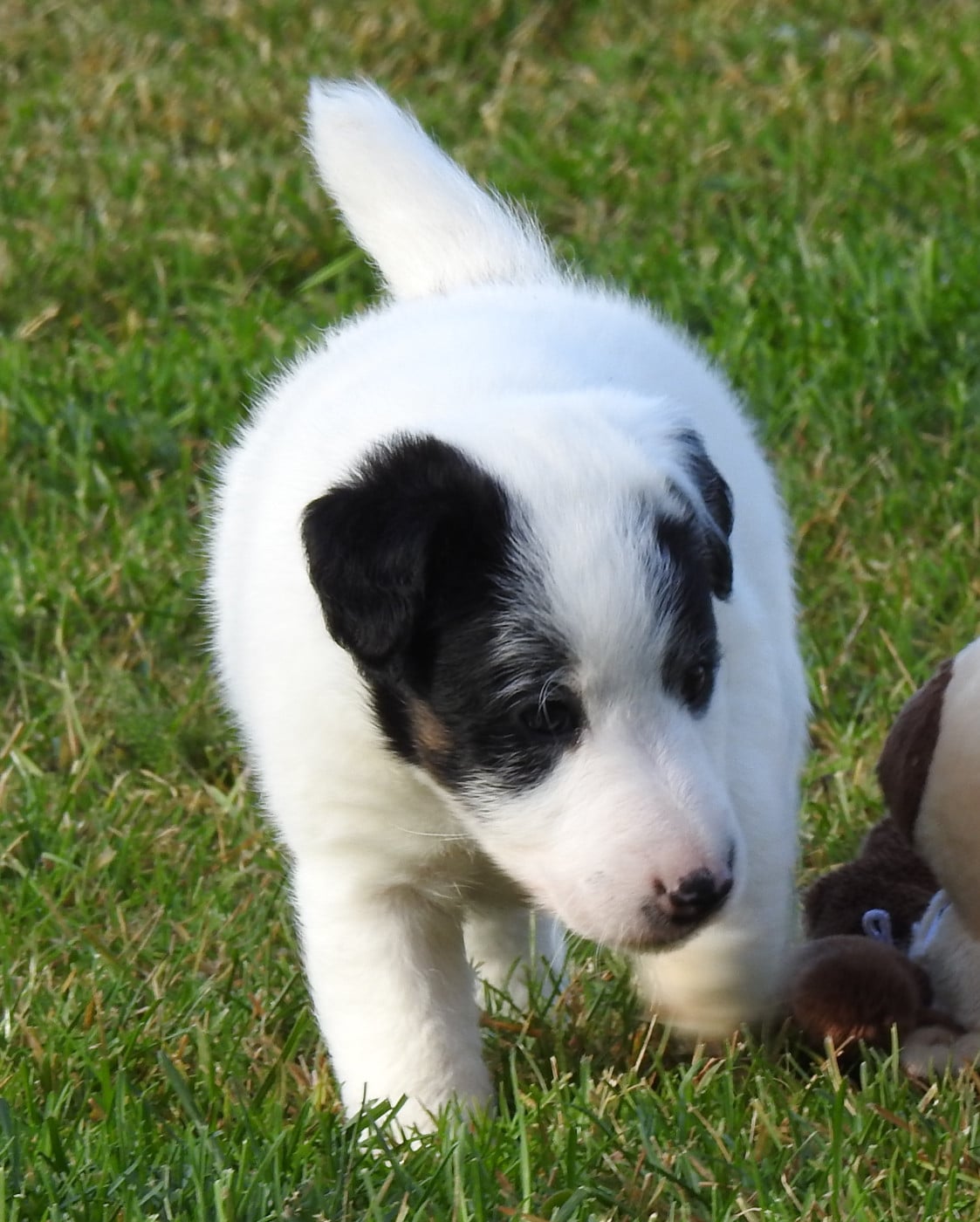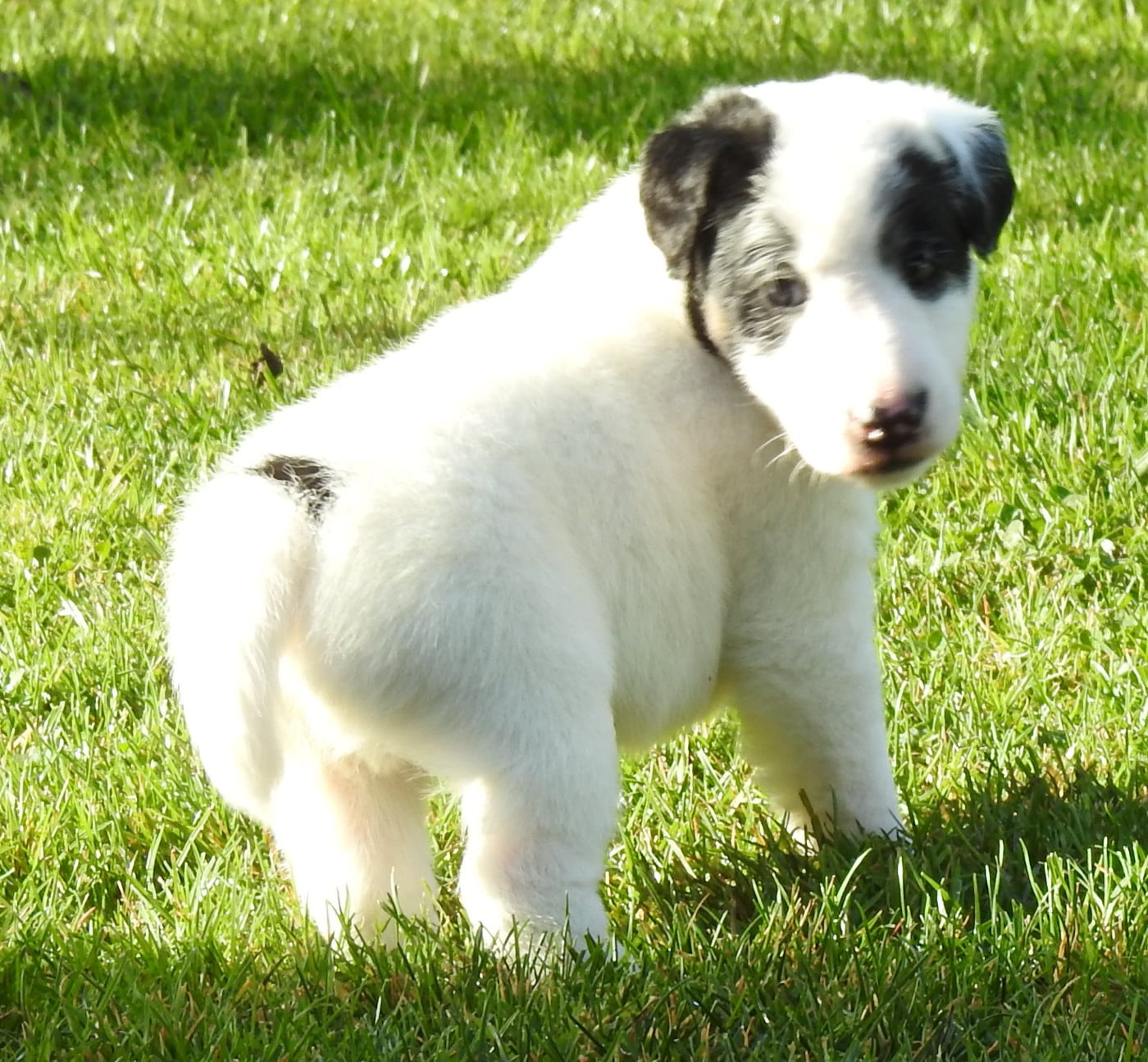 Magnifique chiot mâle avec un marquage marrant noir sur la tête, une tâche noire à la base de la queue, une petite tâche noire sur la patte gauche et le corps blanc.